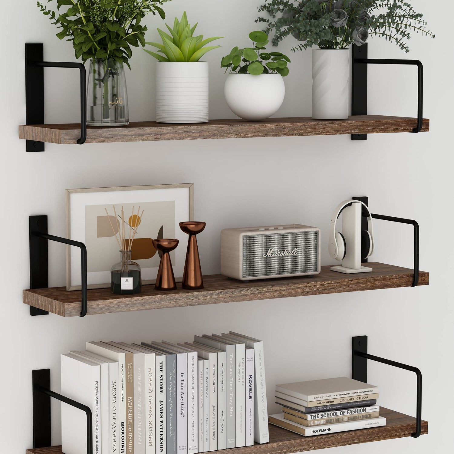 EALLRINEC Floating Shelves - 24 Inch Wall Mounted Set of 3 Rustic Wood Shelves for Wall Decor and Living Room Storage (Brown)