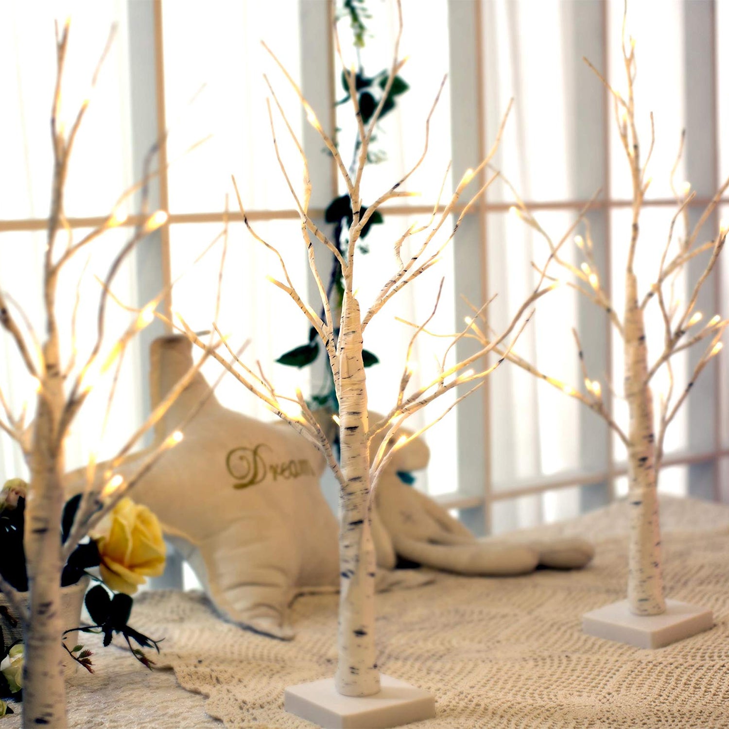 Details: Sliver Birch tree is quite and simple beauty, natural birch tree bark texture, Flexible tree branches and soft warm light looks pretty for both indoor or outdoor decoration, especially when holiday season is coming, when you light the tree Features: 3AA battery operated with a handy on/off switch on its base Scenarios for Home,Party,Festival,Wedding, garden, lawn, yard, park,office room, children's room, restaurant, porch, living room, balcony,Indoor and outdoor Use Fantastic gift for your family, loves, friends, colleagues,Children Specification: Tree height: 2 FT Total LED bulbs: 24 LT LED Color:Warm White Base size:3.95"*3.95" Net Weight: 0.5236lbs(0.238kg) Packing list: 2FT 24 LEDs Birch Tree Light *2 Instruction Mannual* 1 Customer Service: If you have any problem when you receive the goods,Don't hesitate to contact us by message,we must reply you within 24 hours,We are willing to service for you