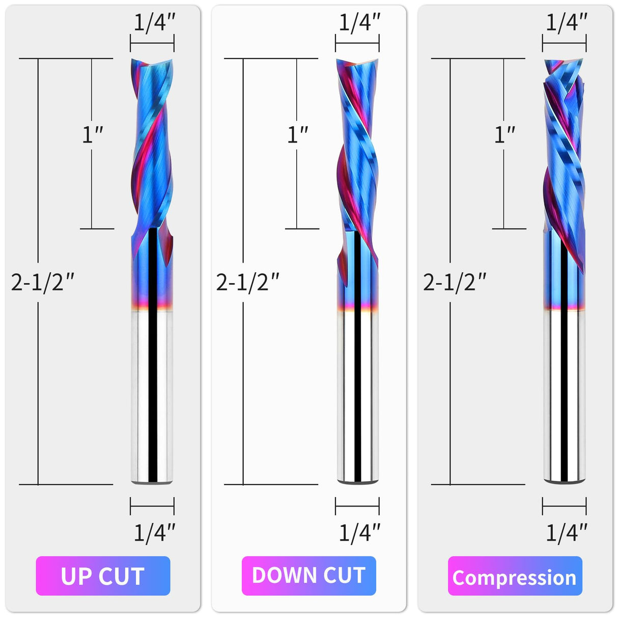 - SOLID CARBIDE AND NANO BLUE COATED: The CNC Router Bits are made of solid carbide. And nano Blue Coating with high hardness and heat resistance enables the tool's cutting edge to retain crucial sharpness and lubricity. This provides longevity and produces cutting results of the highest quality. Clean surface, neat, no glitches.