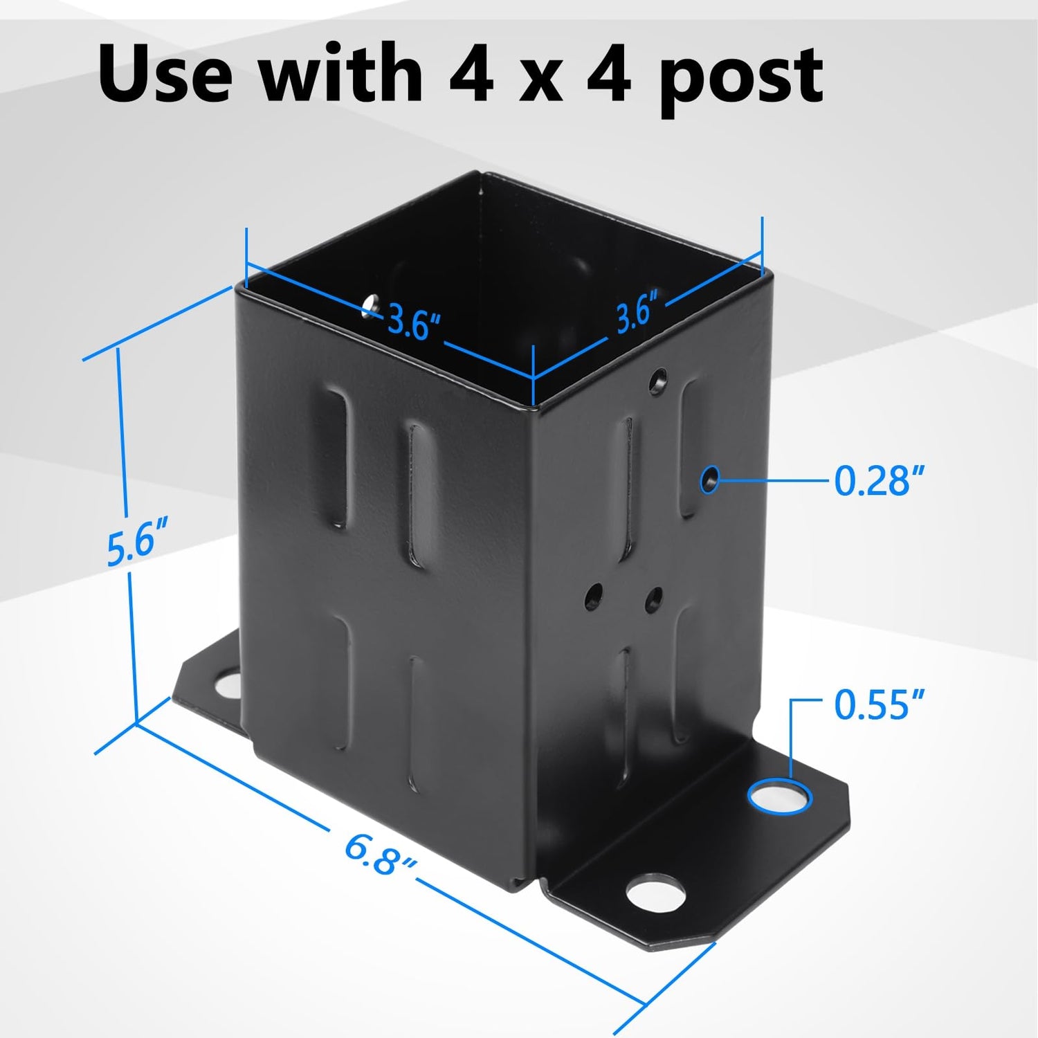 - Use with 4x 4 Post -- Fits a nominal standard 4x4 post (actual 3.6"x 3.6" dry post on market). High up to 5-1/2”, firmly anchored to your concrete slab without problem. Come with 5/8" expansion bolts; suggest using #51 drill bit