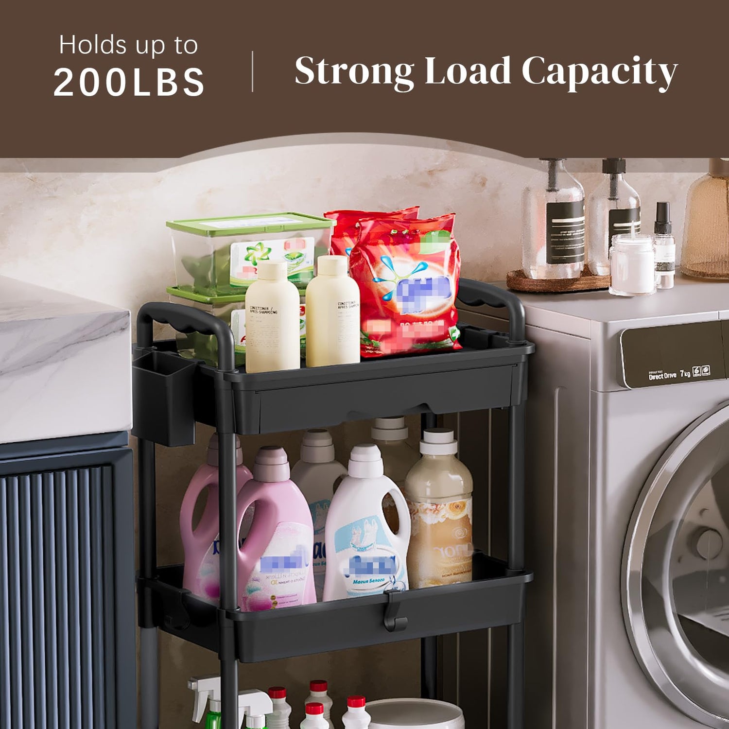 EaseSky Rolling Utility Cart with Drawer 3 Tier, Utility Storage Organizer with Plastic Shelf & Lockable Wheels Multifunctional Storage Cart for Kitchen, Bathroom, Office, Living Room, Black