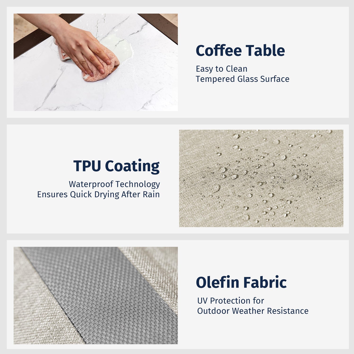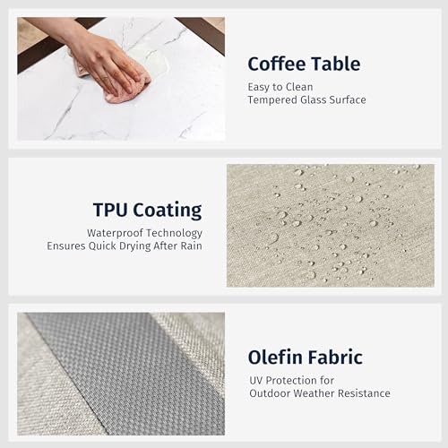 - Ultimate Comfort: Featuring upgraded Olefin fabric and a 6-inch thick cushion, this outdoor patio furniture delivers a luxurious seating experience. The high-density foam provides robust support while ensuring breathability and comfort. The ergonomic design ensures optimal comfort.