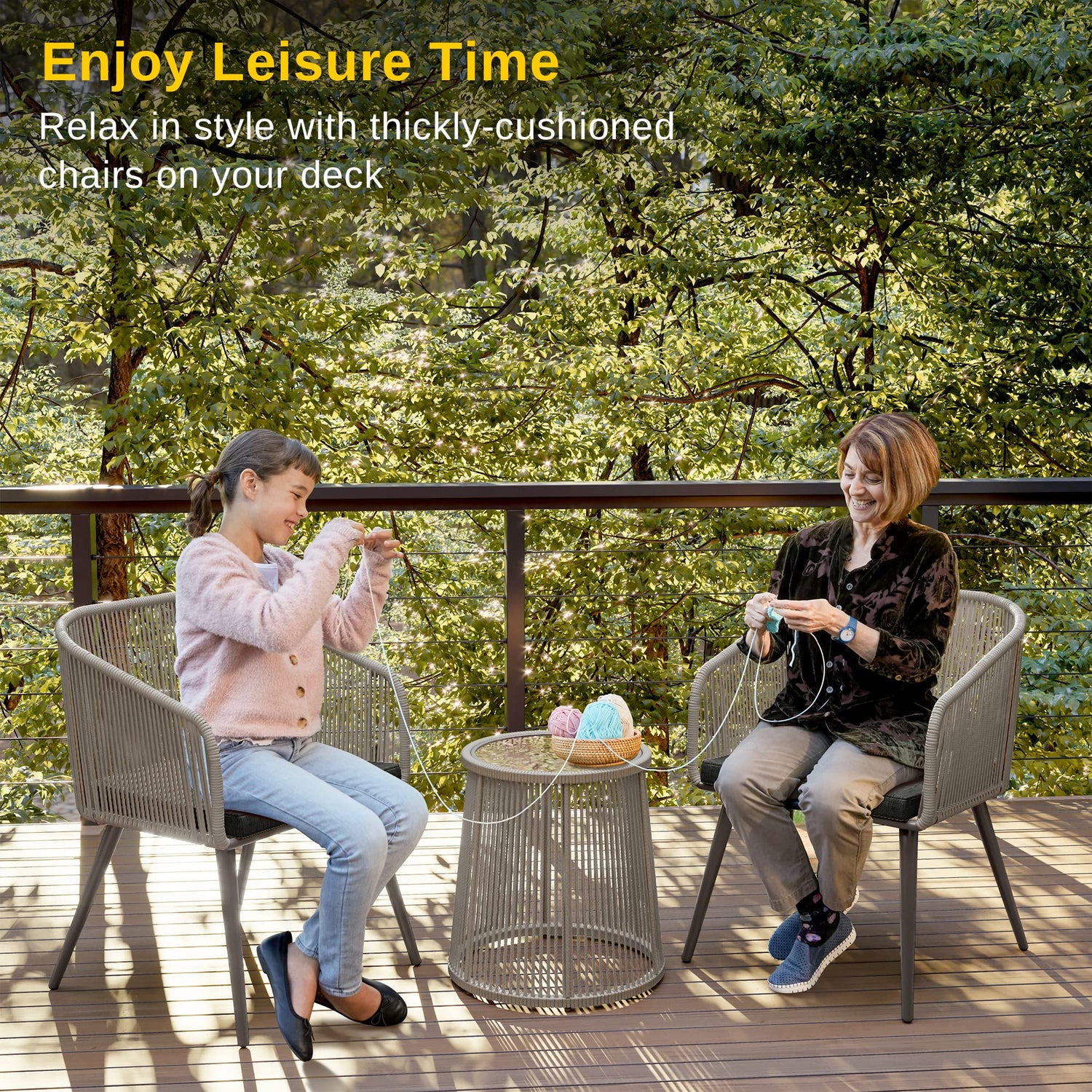 EAST OAK Breezeway Patio Furniture Set, 3-Piece Outside Bistro Set Handwoven Rattan Wicker Chairs with Waterproof Cushions, Tempered Glass Table, Outdoor Conversation Set, Light Grey & Dark Grey
