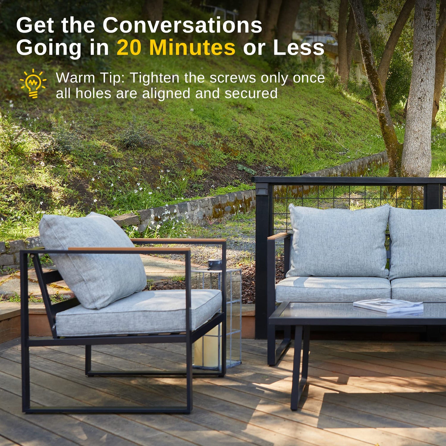 EAST OAK Courtyard Patio Furniture Set, 4-Piece Outdoor Patio Set with Sofa, Removable & Washable Deep Seating Cushion, Tempered Glass Table, Outside Patio Conversation Sets, Black & Grey