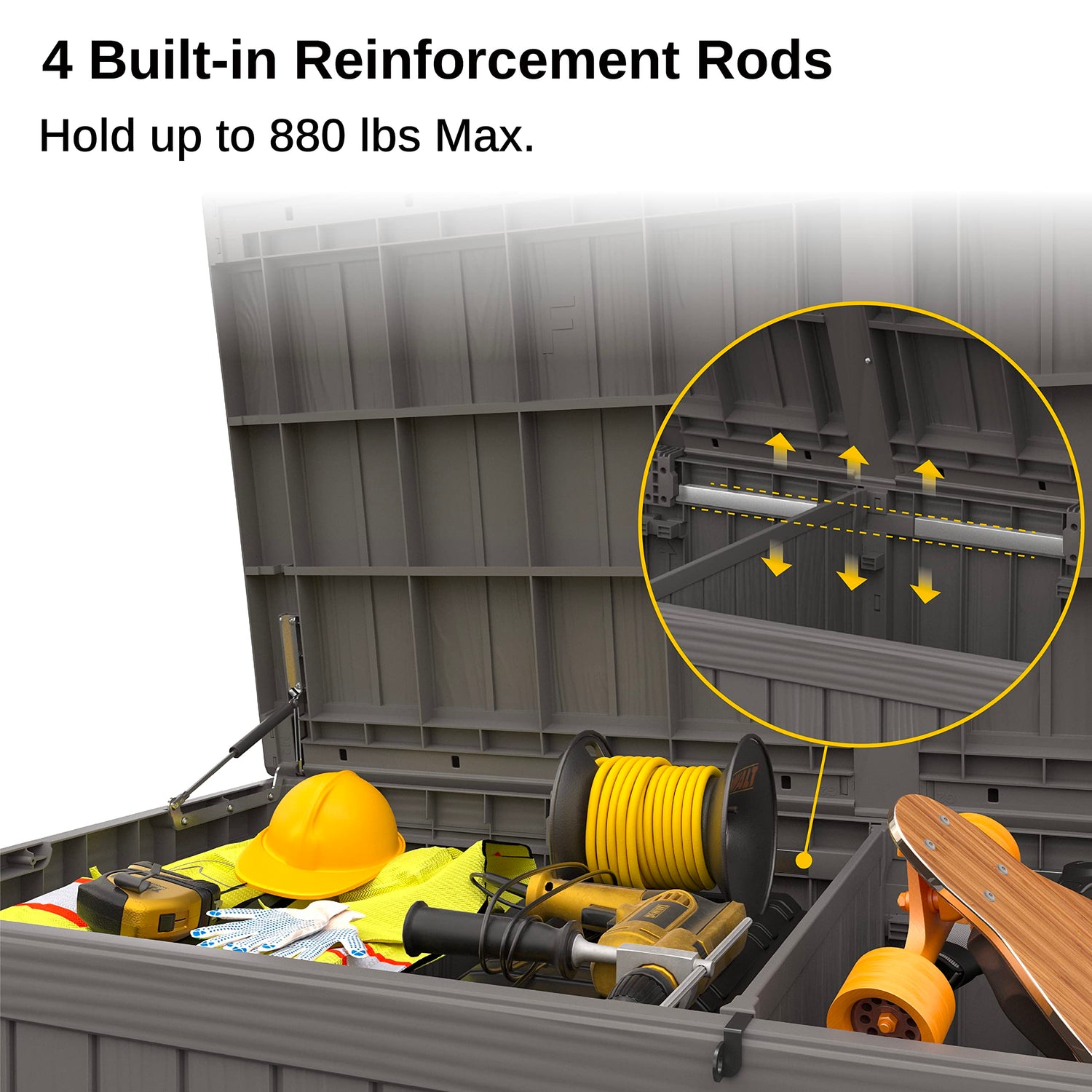 • π—˜π—«π—–π—˜π—Ÿπ—Ÿπ—˜π—‘π—§ π—Ÿπ—’π—”π——-π—•π—˜π—”π—₯π—œπ—‘π—š π—”π—•π—œπ—Ÿπ—œπ—§π—¬: The patio storage box has four built-in reinforcing rods to ensure the deck box can carry heavy items without bending or warping under pressure. And it also can be used as a patio seat or table
