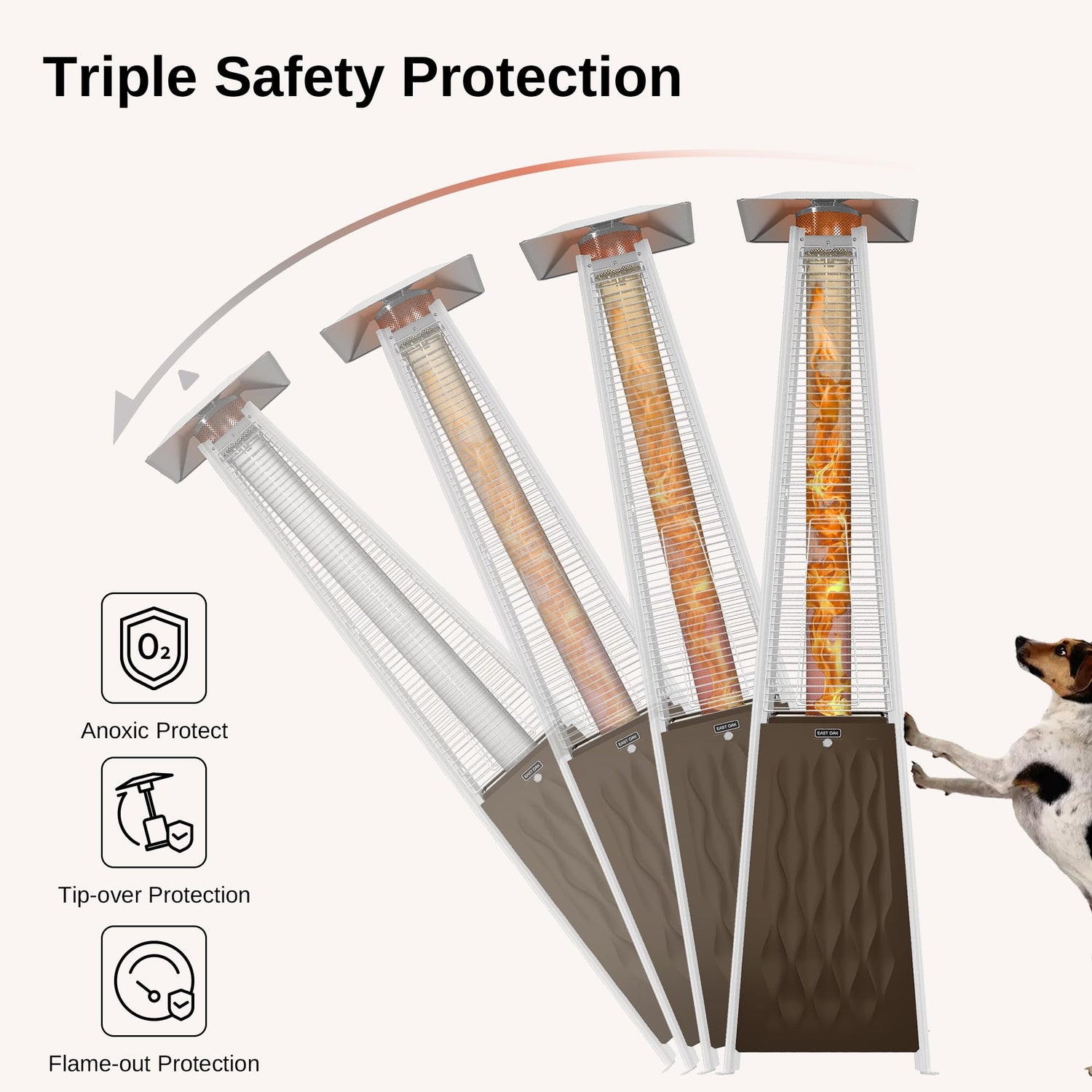 - ๐ง๐ฟ๐ถ๐ฝ๐น๐ฒ ๐ฆ๐ฎ๐ณ๐ฒ๐๐ ๐ฃ๐ฟ๐ผ๐๐ฒ๐ฐ๐๐ถ๐ผ๐ป : EAST OAK propane patio heater offers a triple safety protection system to ensure your well-being. Designed with anti-tip protection, it will automatically shut off the flame when tilted more than 45 degrees. If the flame is accidentally extinguished, the gas supply will shut off immediately