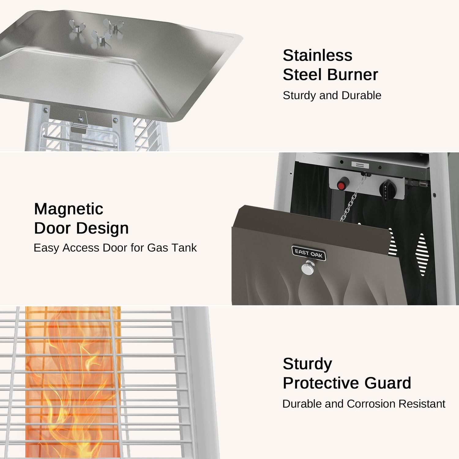 - ๐จ๐ป๐ถ๐พ๐๐ฒ ๐ฃ๐ฎ๐๐ฒ๐ป๐๐ฒ๐ฑ ๐๐บ๐ฏ๐ผ๐๐๐ฒ๐ฑ ๐๐ฒ๐๐ถ๐ด๐ป: Our in-house design team put their hearts and souls into creating the EAST OAK Pyramid Patio Heater. Our goal was to create something that not only worked well but would also be the centerpiece of any outdoor entertaining area. The embossed stainless steel surfaces complement any decor with elegance, and the heaterโs flame feature will be the talk of the neighborhood