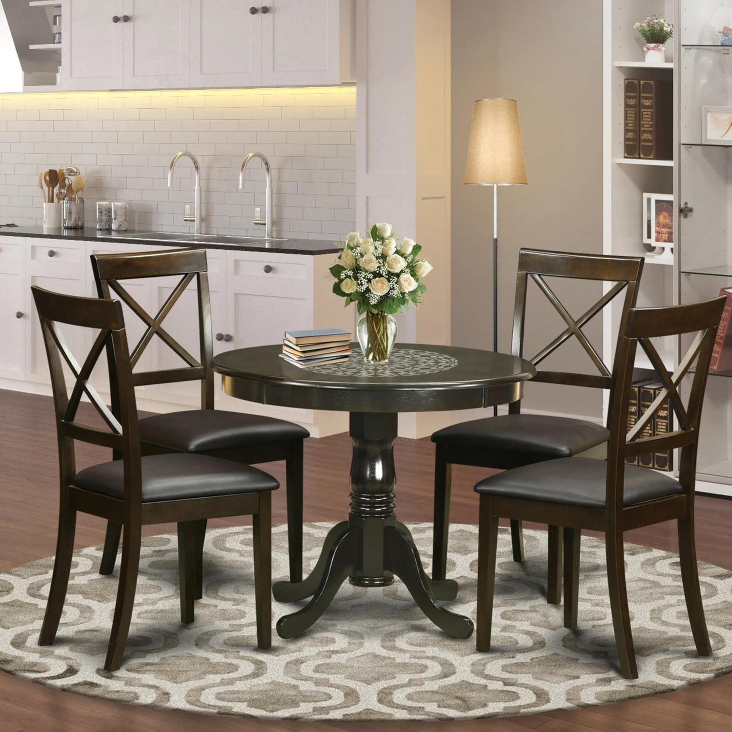 - KITCHEN TABLE SET FINISH: Our Kitchen Table Set features comfortable Faux Leather seats and Pedestal legs. The frame of both the wooden dining chairs and the lovely dining table is crafted from top-quality Cappuccino Finish wood, creating the best possible color combination that adds a high-class touch to your kitchen.