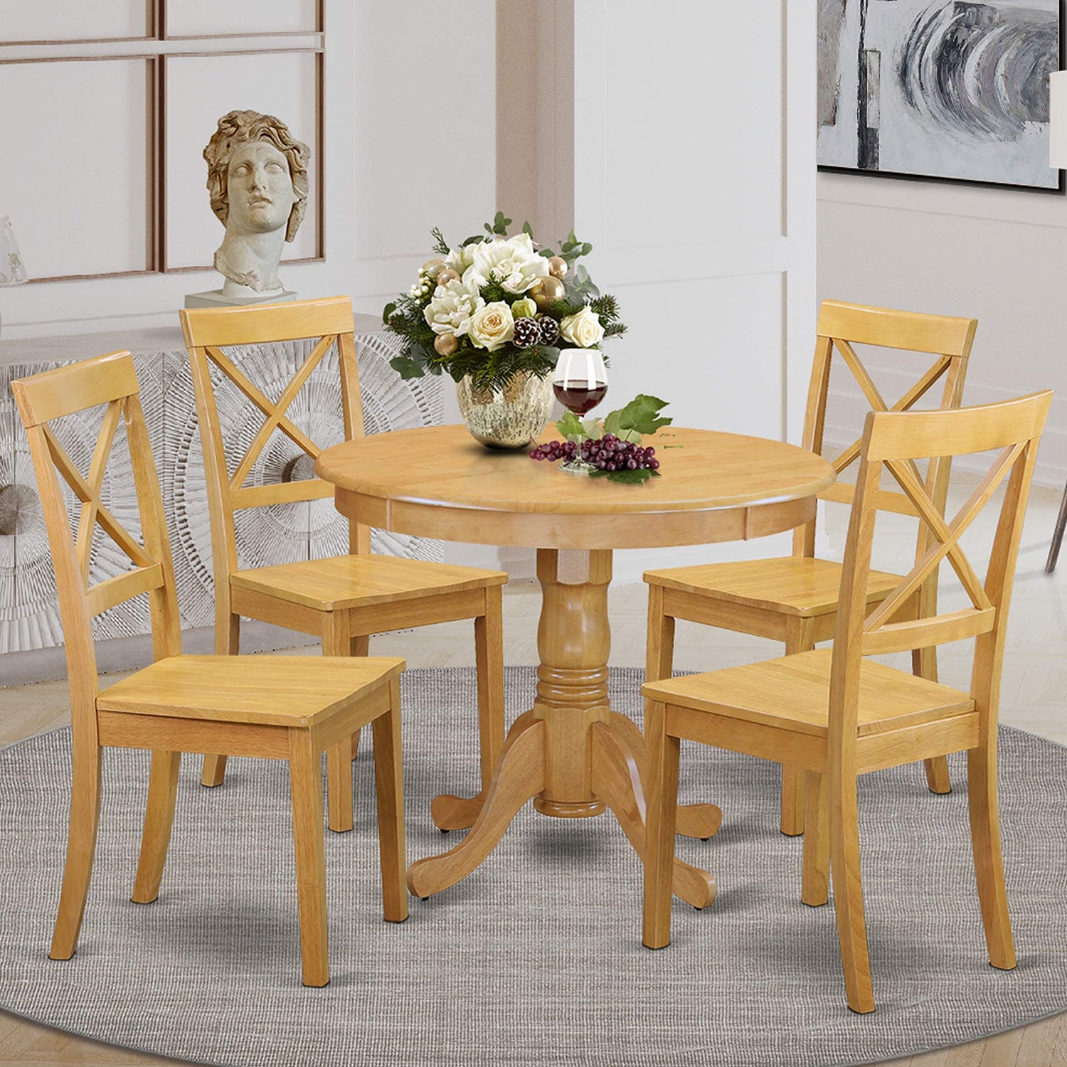 East West Furniture ANBO5-OAK-W 5 Piece Modern Dining Table Set Includes a Round Kitchen Table with Pedestal and 4 Dining Chairs, 36x36 Inch, Oak