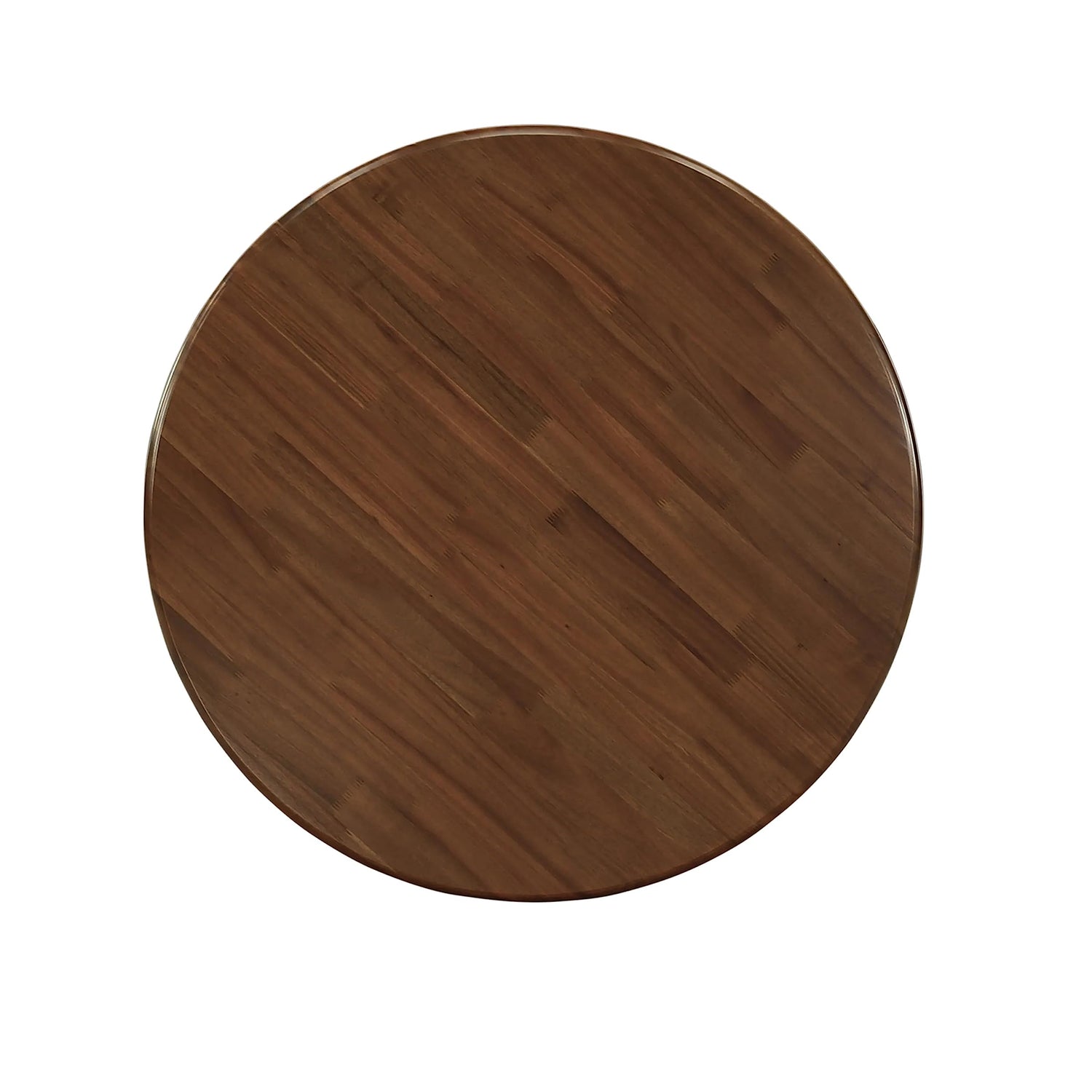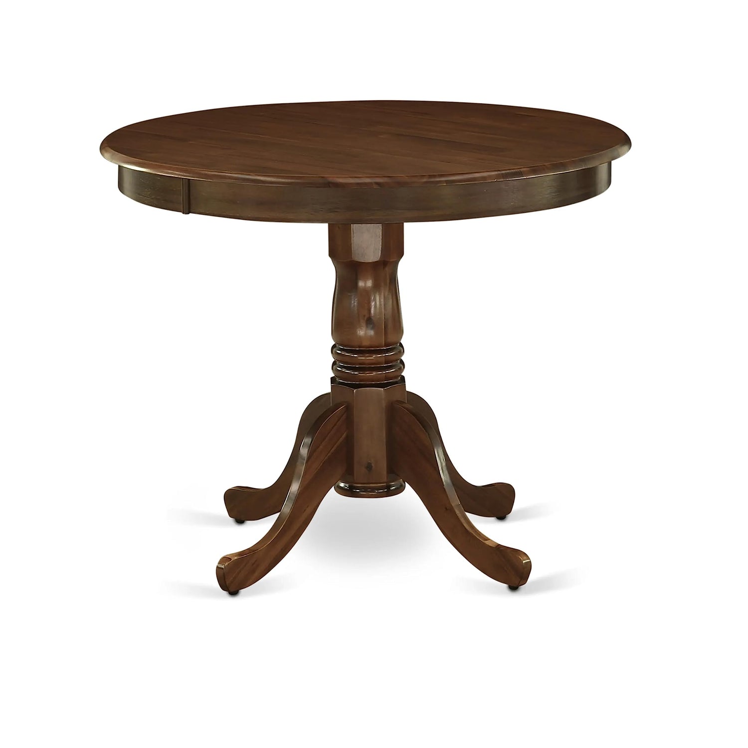 DINING TABLE FEATURES: Material: Rubberwood Shape: Round Base: Pedestal Finish: Antique Walnut Dimensions: Length: 36; Width: 36; Height: 30