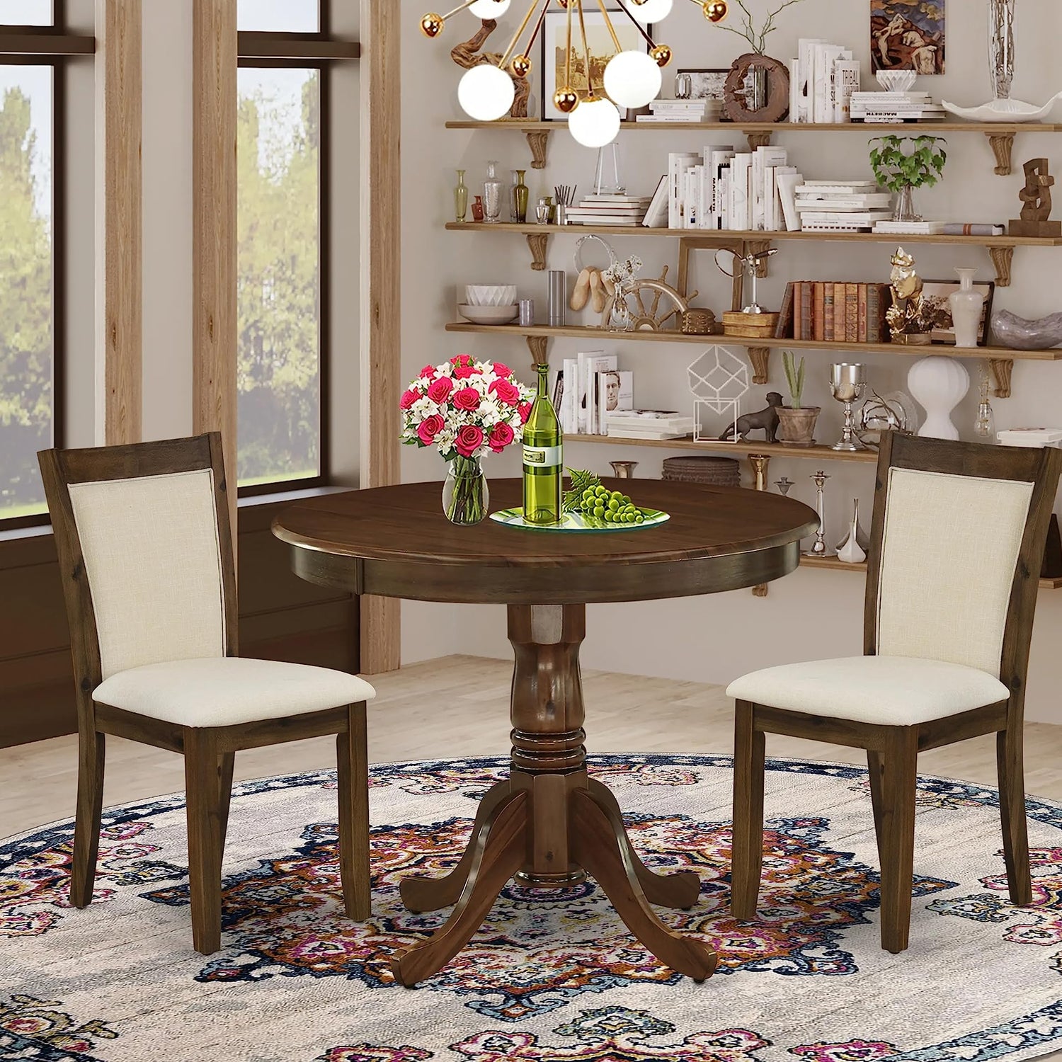 East West Furniture ANMZ3-AWA-32 3 Piece Dining Room Table Set Consist of a Round Kitchen Table with Pedestal and 2 Parson Dining Chairs, 36x36 Inch, Antique Walnut