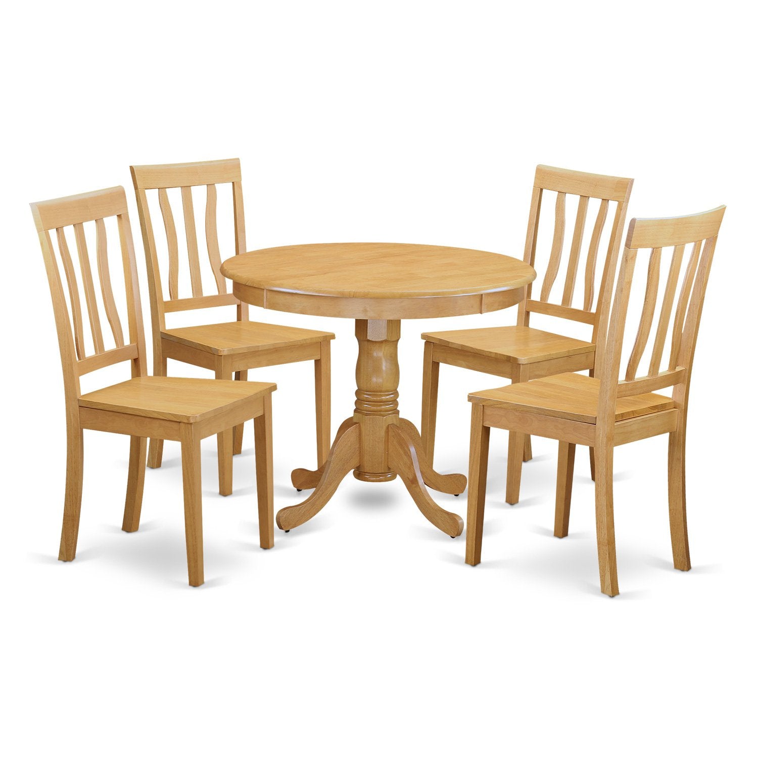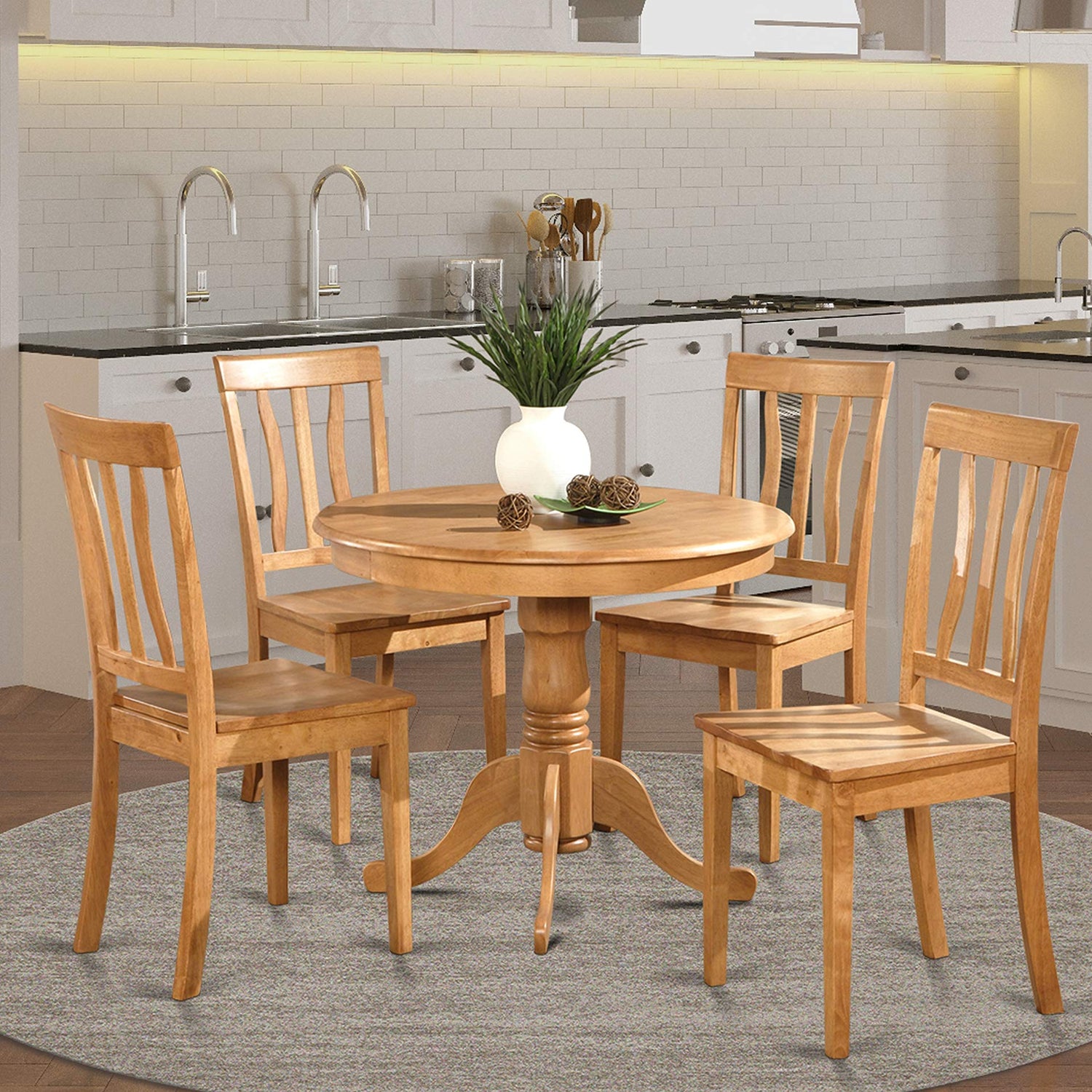 East West Furniture Antique 5 Piece Room Set Includes a Round Wooden Table with Pedestal and 4 Kitchen Dining Chairs, 36x36 Inch, ANTI5-OAK-W