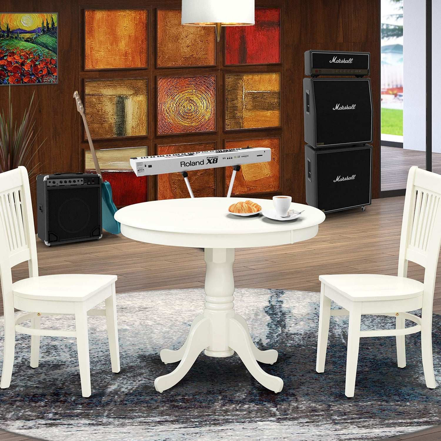 East West Furniture ANVA3-LWH-W 3 Piece Dining Room Furniture Set Contains a Round Dining Table with Pedestal and 2 Wood Seat Chairs, 36x36 Inch, Linen White