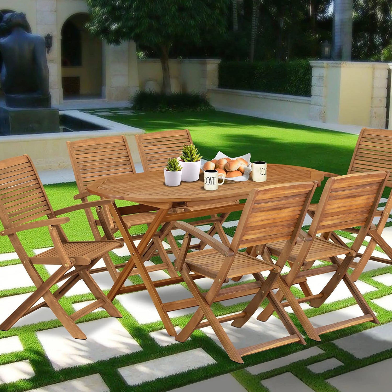 Looking for the perfect patio dining set for your small outdoor gatherings? Look no further than this patio dining set includes an Oval patio dining table with four arm chairs. The set is designed to be both stylish and functional, with a folding feature of the chairs makes it easy to store when not in use. Whether you have a backyard, balcony, or porch, this patio dining set will complement any outdoor area. With its natural oil finish, the set creates an inviting, smooth, lustrous seating arrangement that will enhance any outdoor decor style. Plus, the environmentally friendly finish makes it a great choice for eco-conscious shoppers. Constructed from durable Acacia wood, this patio garden table set is built to withstand various weather conditions and last for years to come. Another Key feature of this patio dining set is that it is easy to maintain. Restaining the furniture once a year can help to keep it looking brand new and extend its lifespan. The rustic design adds charm to any outdoor space, while the burr-free finish ensures a comfortable dining experience. Assembly is a breeze thanks to the easy-to-follow instructions included in the package. No additional tools are required, so you can have your new patio garden table set up and ready to use in no time. Enjoy the warm weather with family and friends while soaking up the beauty of the great outdoors with this high-quality patio bistro dining furniture set.