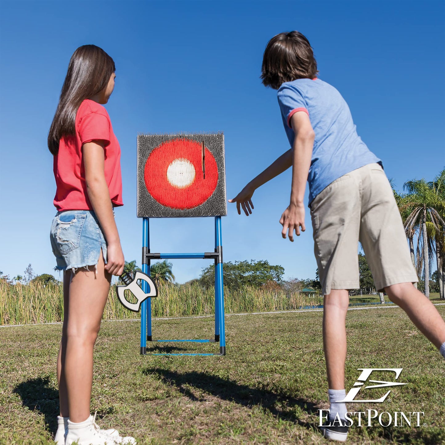 Details: Introducing the ultimate in outdoor gaming fun, the EastPoint Sports 2-in-1 Axe Throw and Lawn Dart Target. This versatile game set is a must-have for those seeking excitement and friendly competition. Standing tall at 44 inches, the target provides an authentic and challenging axe throwing experience. Crafted from high-quality plastic, it ensures durability and longevity, making it perfect for outdoor use. The 18" x 18" plastic bristle bullseye target guarantees accurate scoring and adds an extra layer of excitement to the game. With safety as a top priority, the set includes six foam and plastic axes designed to offer a balance between safety and performance. The foam axes feature a soft and lightweight construction, minimizing the risk of injury without compromising the thrill of throwing. The plastic axes provide durability and accuracy, ensuring an enjoyable gaming experience for players of all ages. For added variety, the game set also includes four bristle lawn darts, expanding the gaming possibilities and keeping the excitement going. Setting up the game is a breeze, and its portable design allows for easy transportation and storage. Whether you're hosting a backyard gathering, planning a picnic, or going on a camping trip, this game set guarantees endless hours of entertainment for family and friends. Get ready to unleash your inner lumberjack or test your aiming skills with this versatile and exhilarating plastic axe throwing target game.