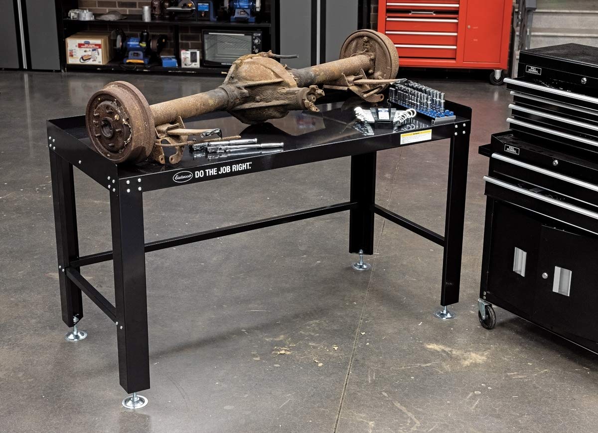 This heavy-duty metal workbench will quickly become a reliable partner in your restoration projects. Made with a top and legs of 14 gauge steel, this shop table handles up to 1,600 pound easily. The legs are adjustable to ensure a stable, wobble-free surface.