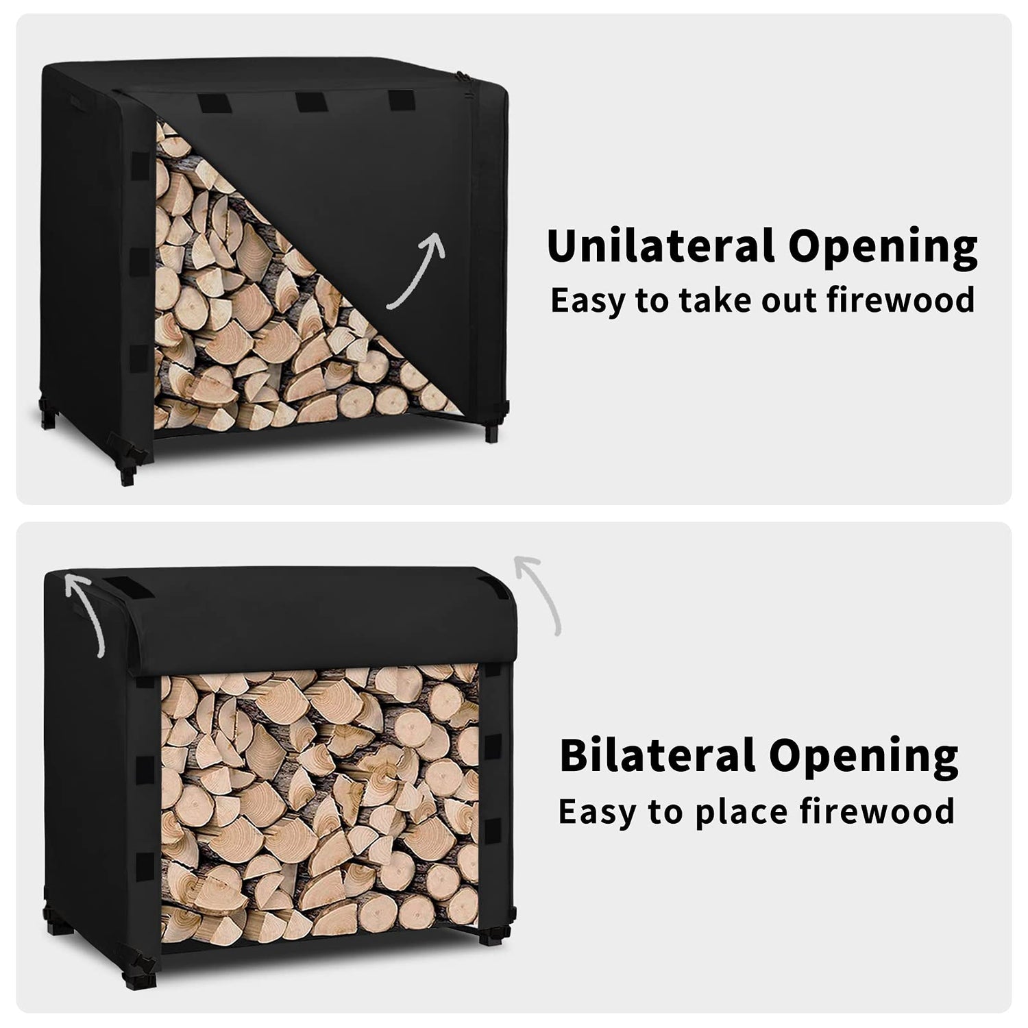 Details: Item: Log Rack CoverFabric: 600D Oxford FabricSize Available: 48" L x 24"W x 41"H, 96" L x 24"W x 41"HColor Option: Black, Dark Gray, CamelFunctions:1. The firewood cover is 100% waterproof, providing protection against rain, snow, UV, dust and other harsh weather element.2. The front flap is closed by velcro, can be opened on one side or two sides, making it easy to place or take the firewood.3. There is a handle at each side of cover makes it easy to put on and take off.4. Click-close straps snap over legs to secure the firewood cover on windy days.Warm Tips: The log rack cover can not be washed in the machine. If there is any dust, it is suggested to wipe with water.