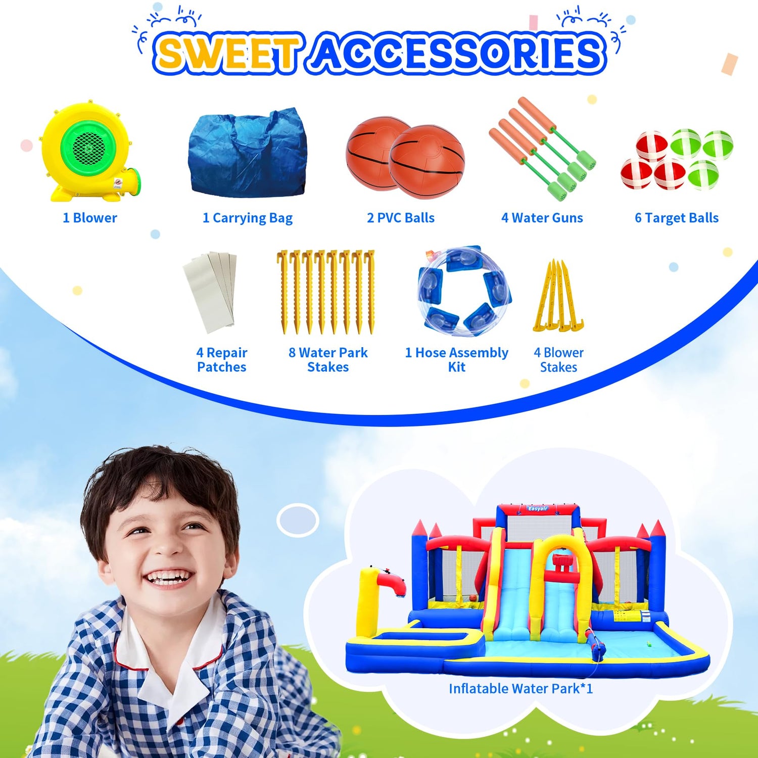 - Double Inflatable Bouncer Plus Large Slide Water: Bounce house, climbing wall, double track splash slide, large splash pool, target shooting game, basketball hoop set, brings outdoor water fun for kids, brings together a variety of water adventures for groups of kids to enjoy endless hours of shared water fun