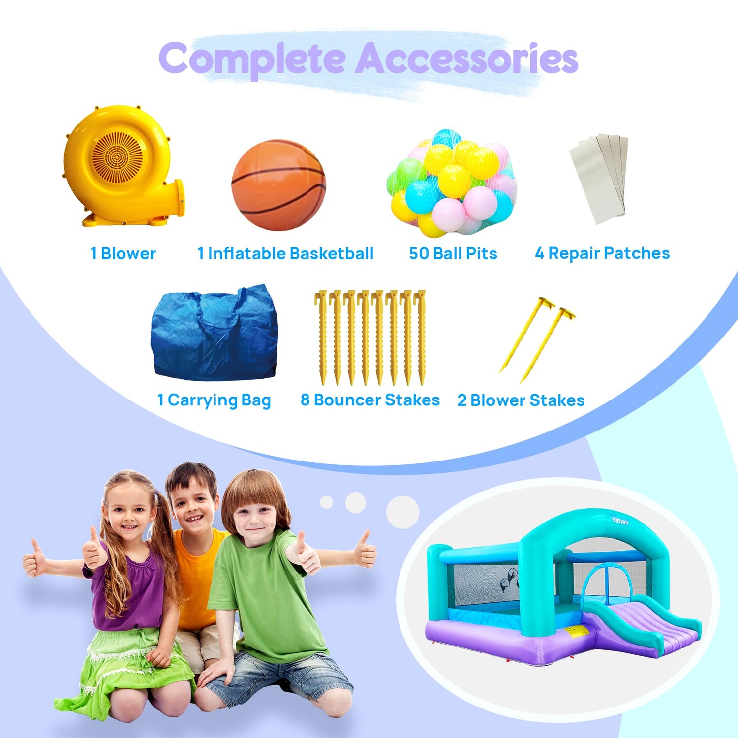 - Easy to set up in just three minutes: Portable for use in parks, garages and backyards. Includes a trampoline, blower, repair patch, castle stakes, ball pit (approximately 50 pieces), basketball and carry bag. Designed for ease of use and portability playground sets for backyards