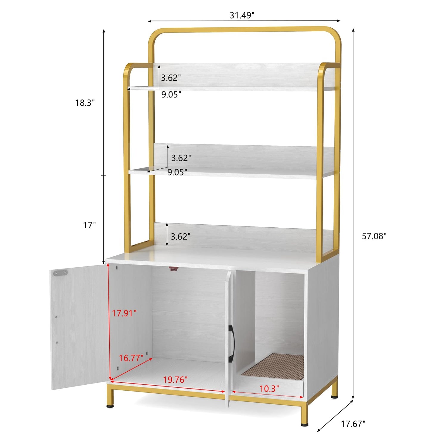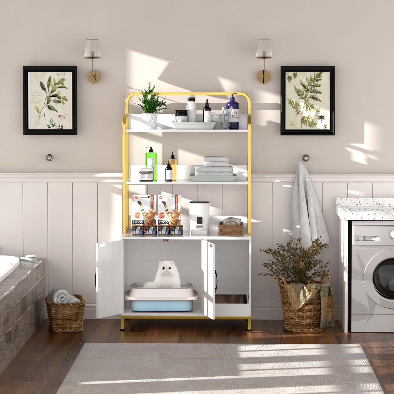 - 【Versatile Glamorous Design】The cat litter box furniture featuring cat house, hidden litter box, and storage shelves, combines white board and gold frame. The white element creates a sense of brightness, while the gold accents add a touch of glamour to your home.