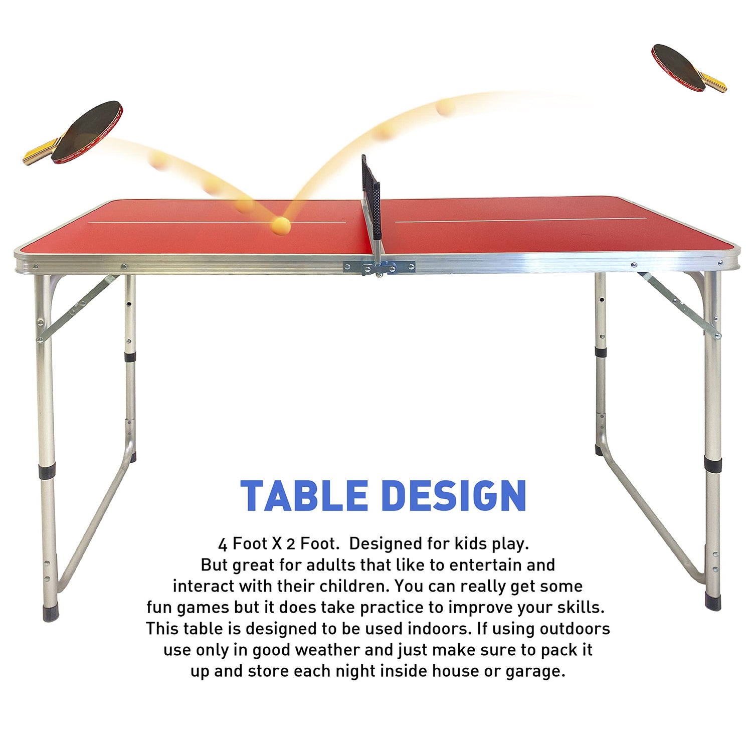 - π TABLE DESIGN β 4 Foot X 2 Foot. Designed for kids play. But great for adults that like to entertain and interact with their children. You can really get some fun games but it does take practice to improve your skills. This table is designed to be used indoors. If using outdoors use only in good weather and just make sure to pack it up and store each night inside house or garage.
