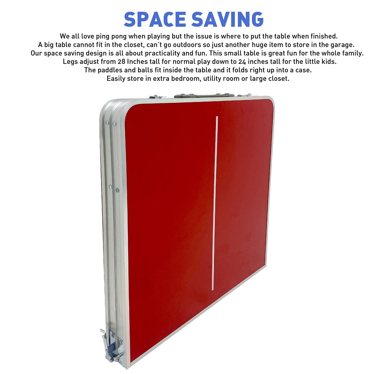 - π SPACE SAVING β We all love ping pong when playing but the issue is where to put the table when finished. A big table cannot fit in the closet, canβt go outdoors so just another huge item to store in the garage. Our space saving design is all about practicality and fun. This small table is great fun for the whole family. Legs adjust from 28 Inches tall for normal play down to 24 inches tall for the little kids. The paddles and balls fit inside the table and it folds right up into a case.