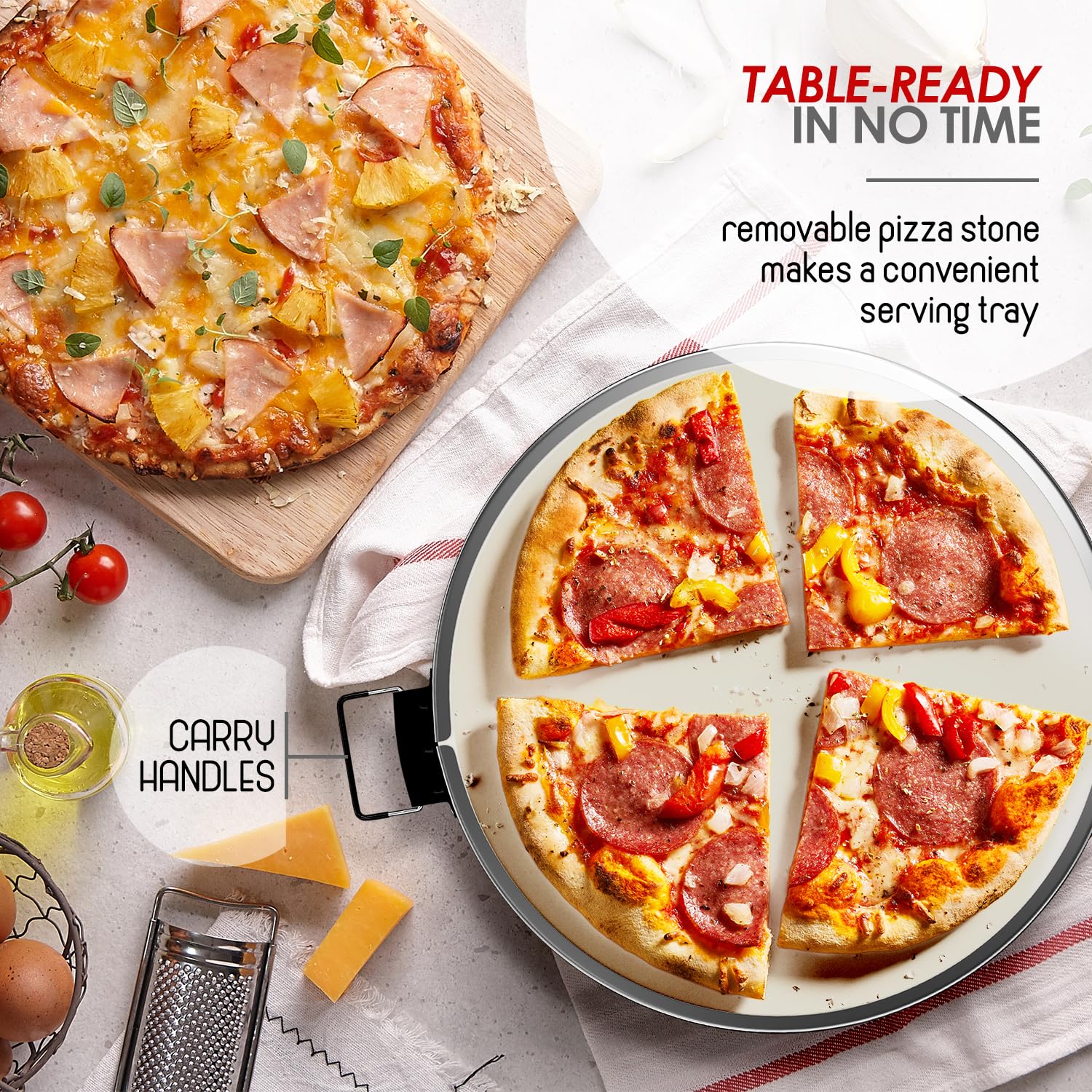 - 12” Stone Pizza Oven Indoor: Our indoor pizza oven creates a perfect, crispy crust, with top and bottom heating elements and a flat, nonstick ceramic pizza stone (removable for easy cleaning).