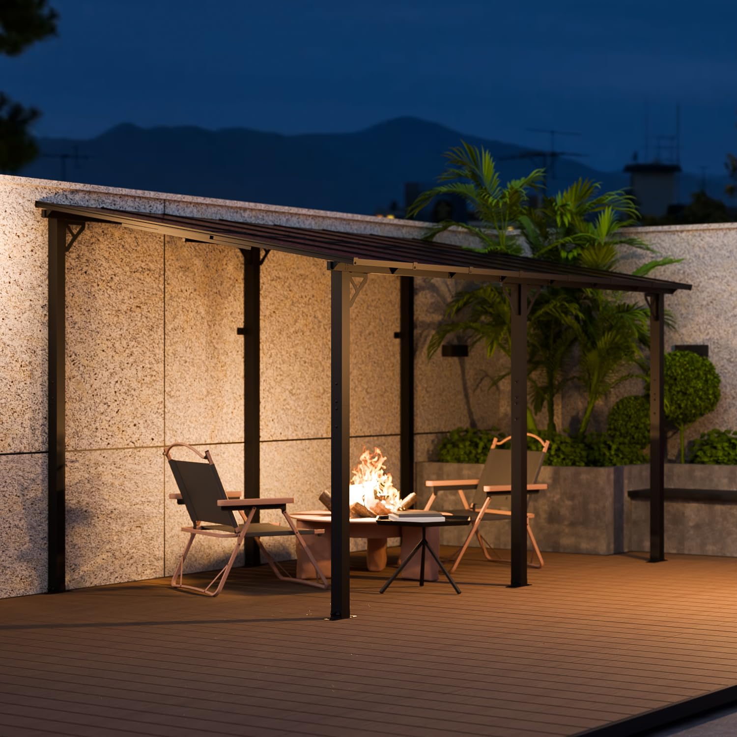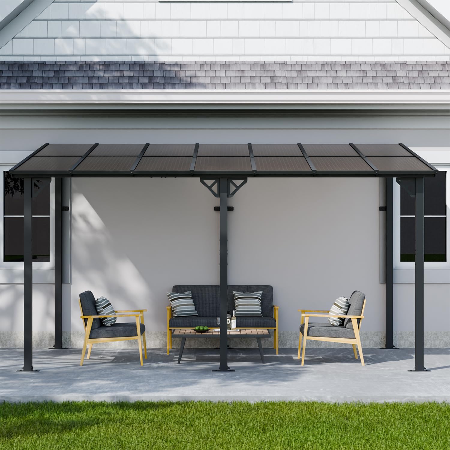- 【UNIQUE ROOF DESIGN】The high-quality Polycarbonate roof not only provides shade from the sun and prevents damage from harmful ultraviolet rays, but also protects against rain and snow, providing residents with a cool and comfortable space. The roof of the wall gazebo is sloped and designed with drainage channels to effectively reduce the pressure on the roof from rain and snow accumulation. The pergola roof is supported by aluminum tubes to provide extra stability.