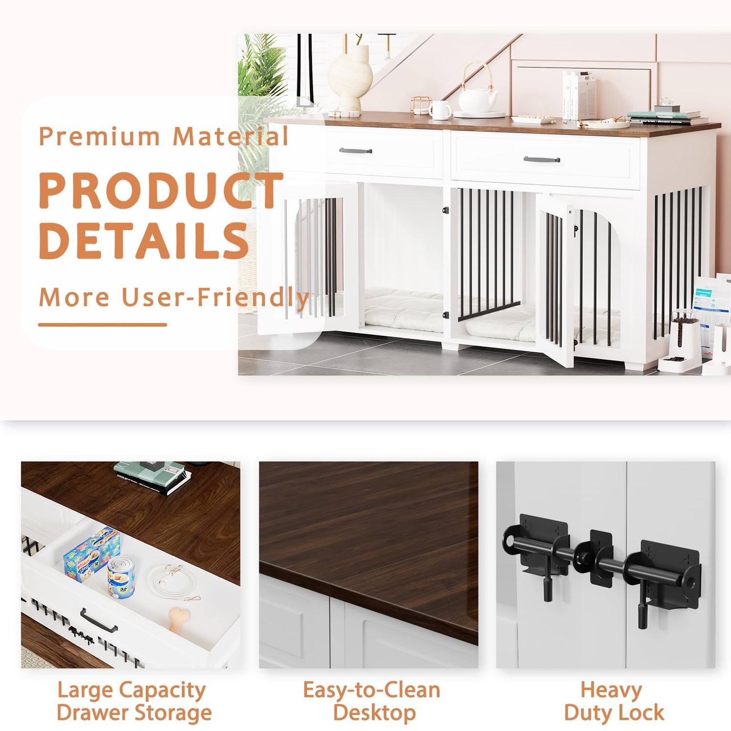 - 【AMPLE STORAGE SPACE】he large dog crate furniture is equipped with two large-capacity drawers that can store toys and food for your furry friends, making your home cleaner and more organized. In addition, this wooden dog crate has an extra-large smooth tabletop, perfect for displaying home decorations such as plants, magazines, and family photo frames.