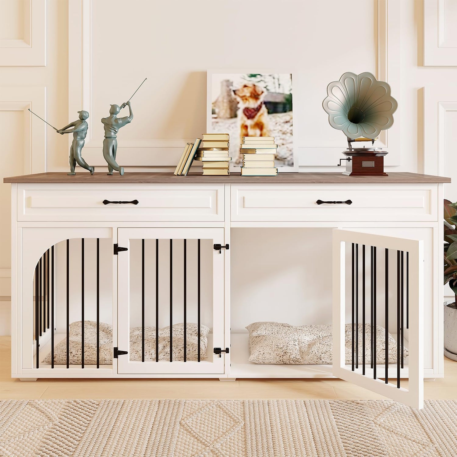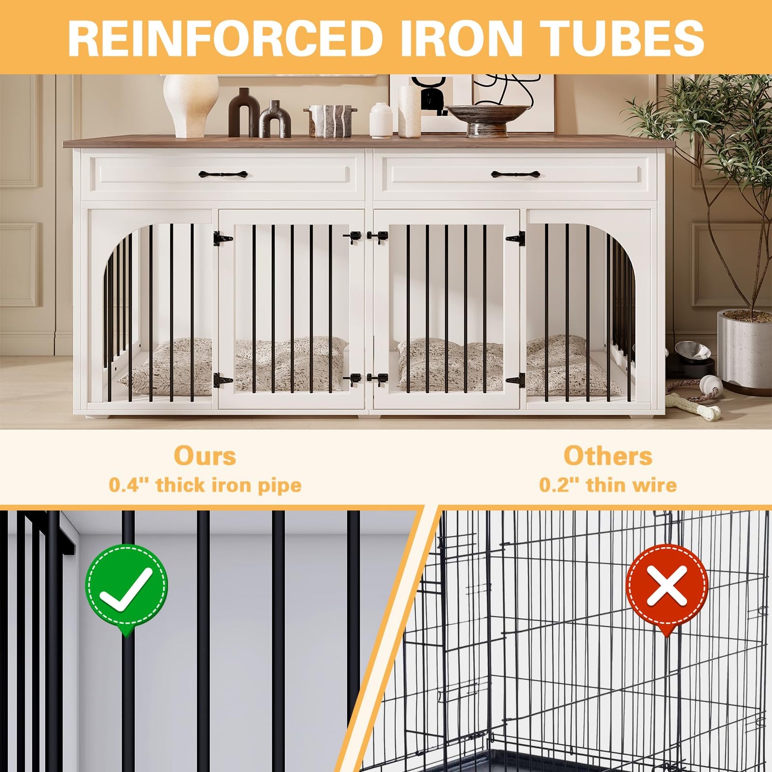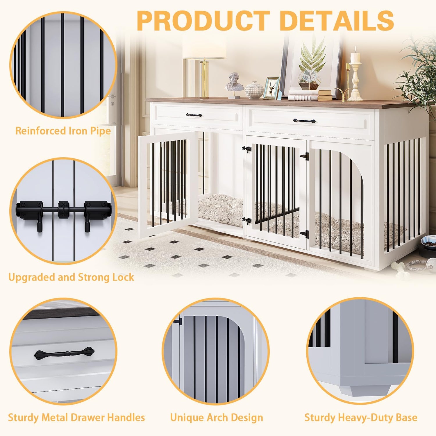 - [AMPLE STORAGE SPACE]The double dog crate furniture is equipped with two large-capacity drawers, where you can place pet supplies or other sundries to make your home cleaner and more orderly. In addition, this wooden dog crate has an extra-large smooth tabletop where you can place a TV and various ornaments.