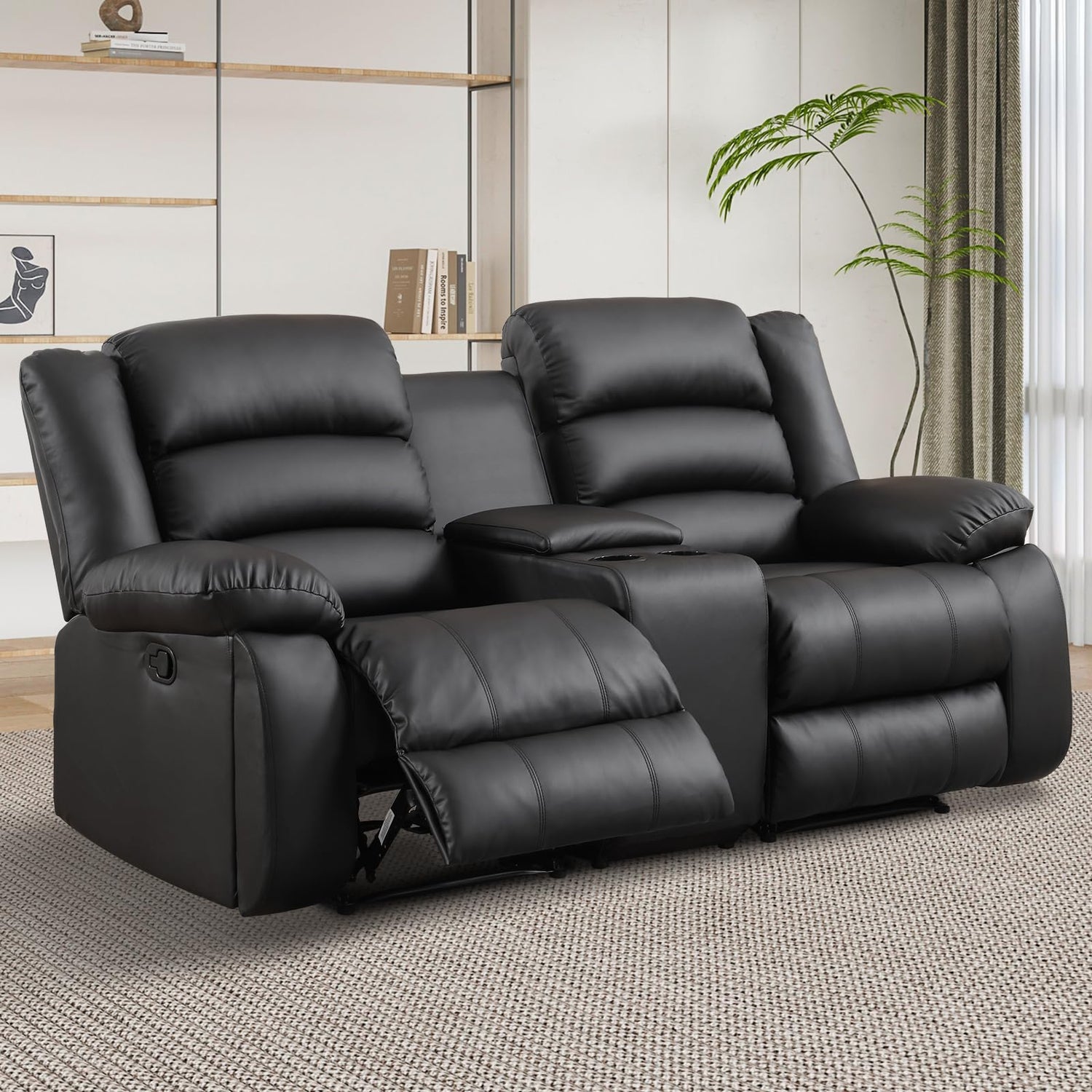 EBELLO Faux Leather Manual Loveseat Recliner, Reclining Sofa Chair with 2 Concealed Cup Holders, Hidden Storage, Overstuffed Armrest Couch Set for Living Room, Bedroom, Meeting Room, Black