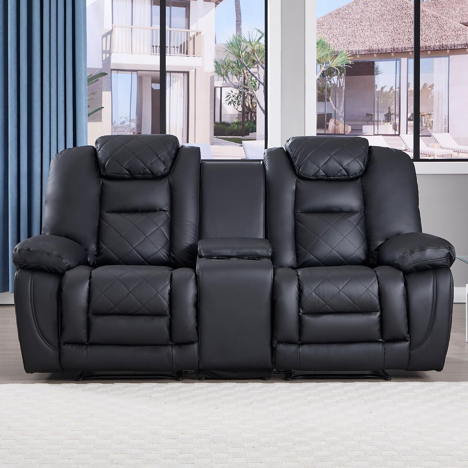 EBELLO Faux Leather Manual Loveseat Recliner Sofa, 2 Seat Reclining Couch Chair with Center Console, Hidden Storage and Cup Holders, Home Theater Seating for Living Room, Black (Loveseat)