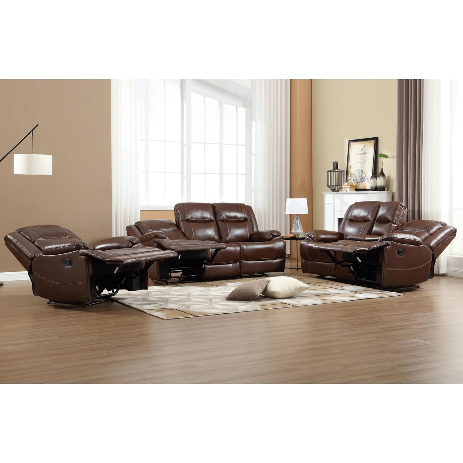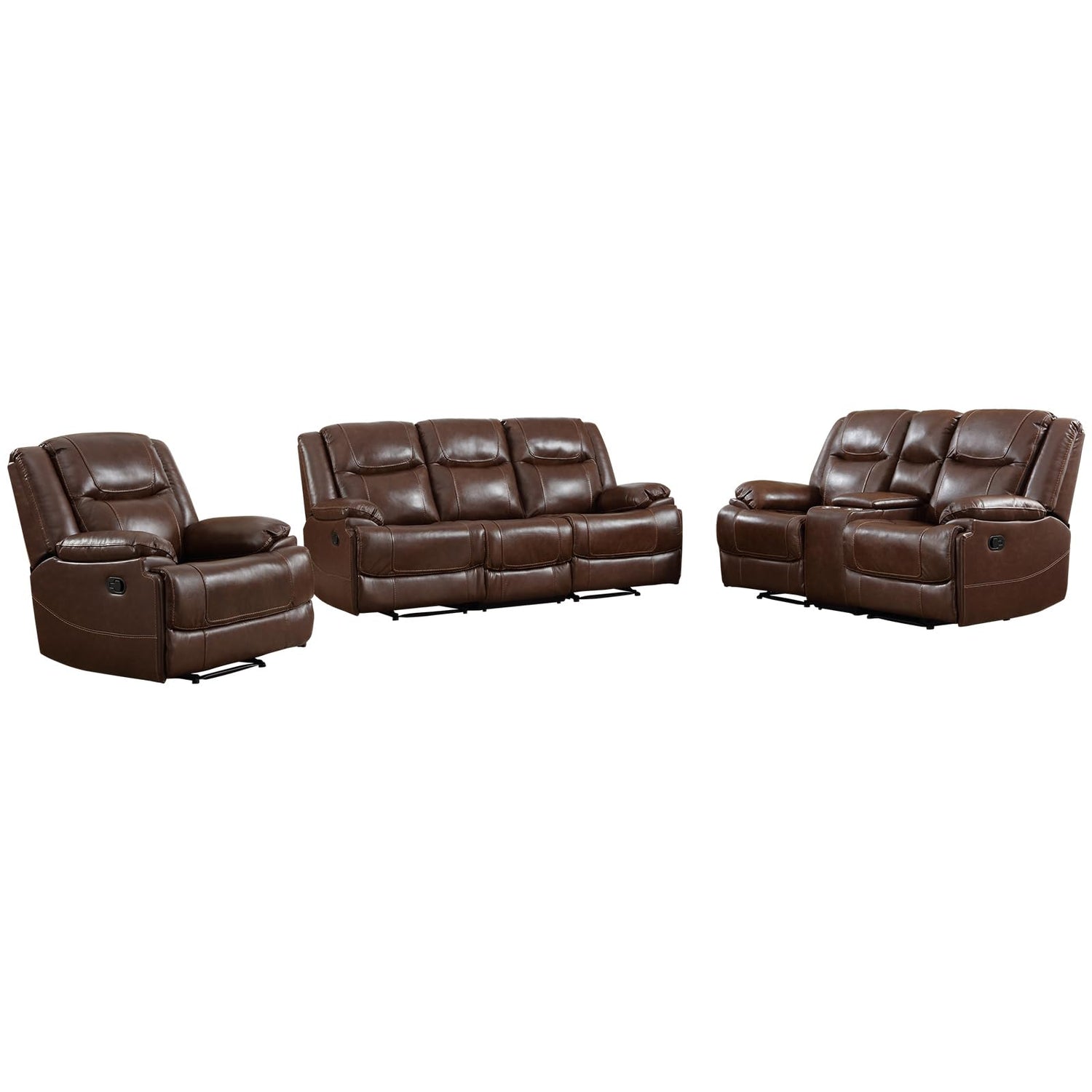 - 【Spacious Seating and Ample Room】: The set's configuration provides ample seating for multiple individuals. The 3-Seat recliner sofa, loveseat reclining sofa, and recliner chair offer spacious and cushioned seating areas, accommodating various numbers of people comfortably.