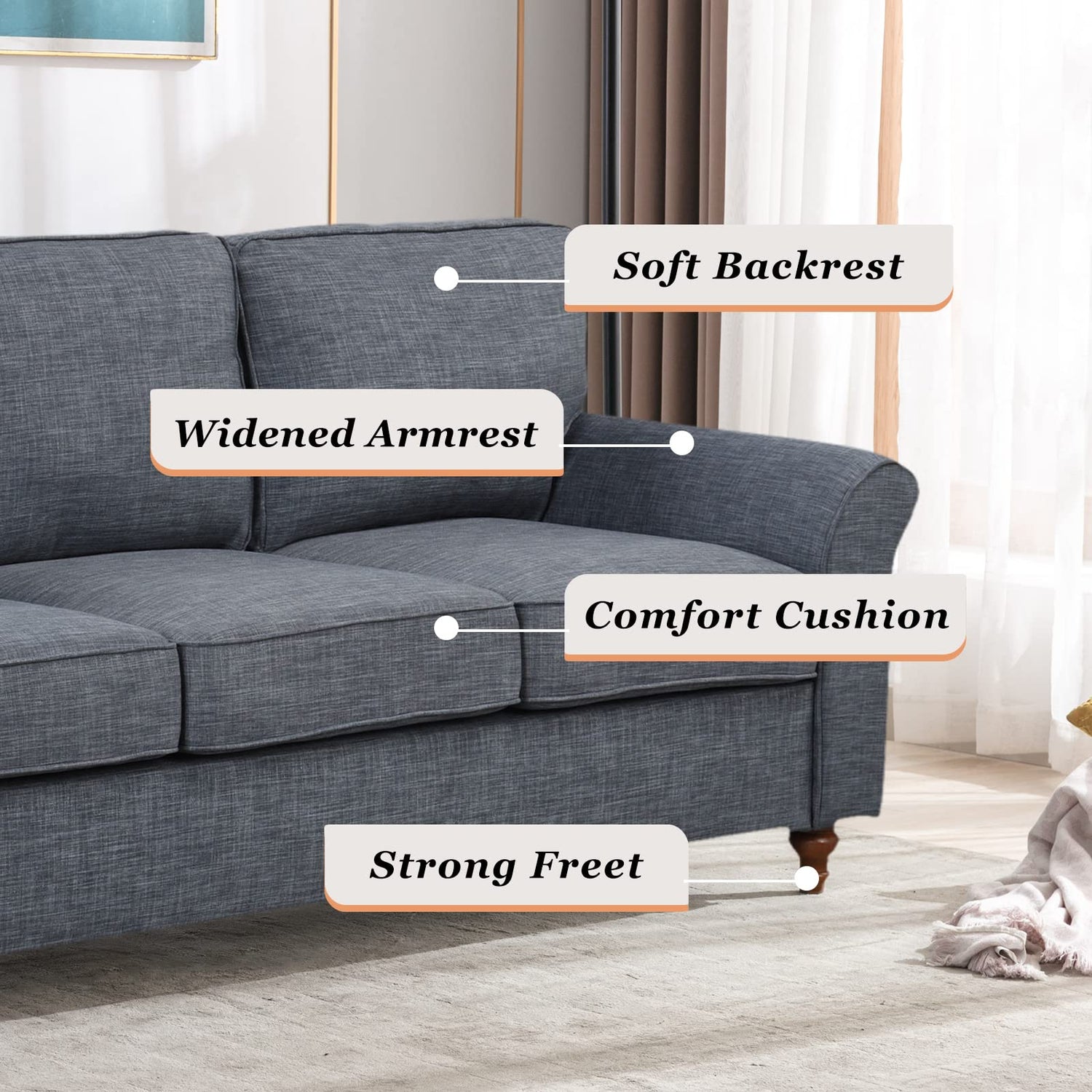 - Comfortable Linen Fabric Upholstery: The grey linen upholstery of this comfortable sofa is soft and comfortable to the touch, providing a comfortable and cozy seating experience. This linen fabric loveseat sofas also easy to clean and maintain.
