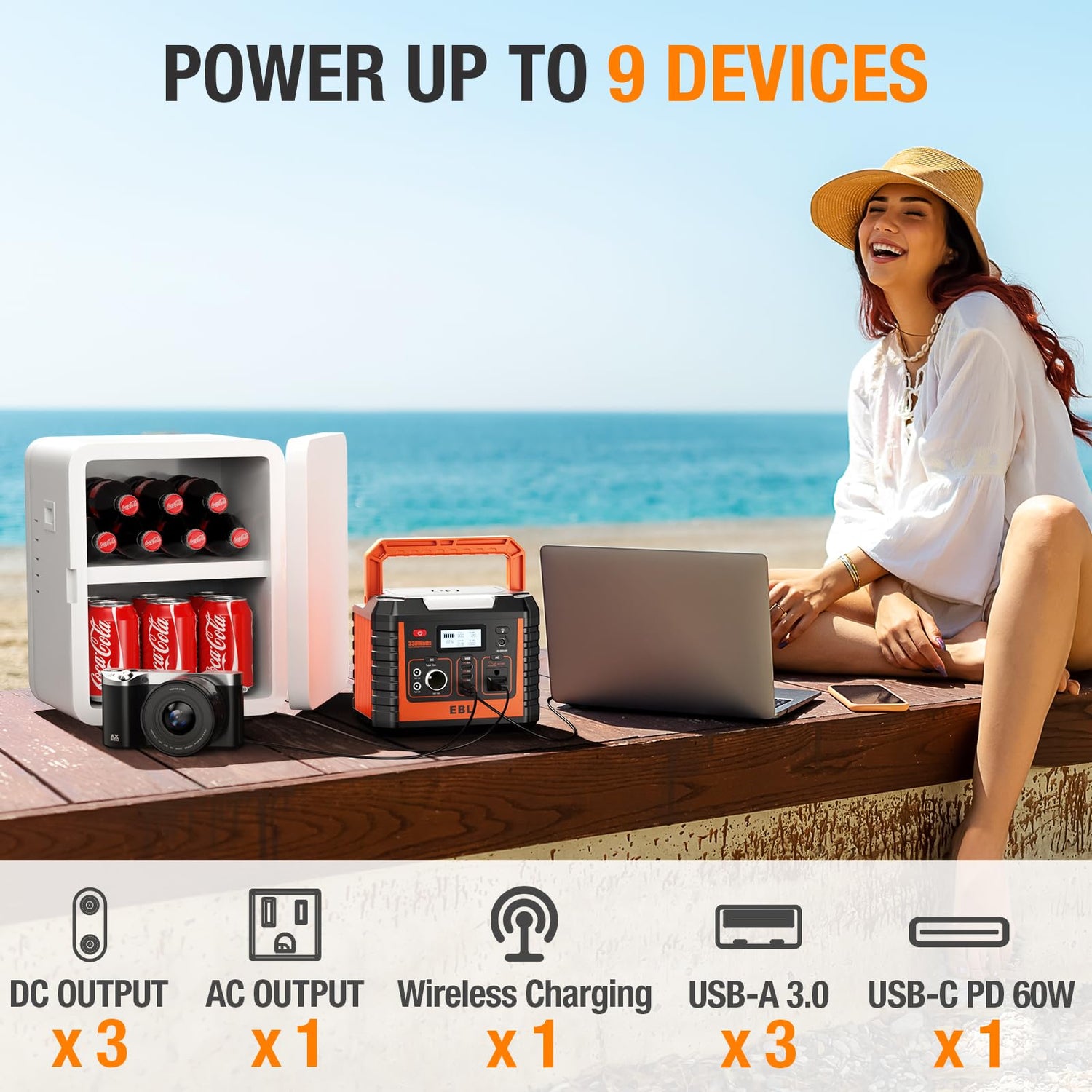 - 【Solar Energy & Green Power】: EBL 330W power station device supports solar charging and is recommended for use with solar panels together. You can enjoy your wonderful holiday for tent camping, overland journey and etc with it. Power failure and emergency is also applicable.
