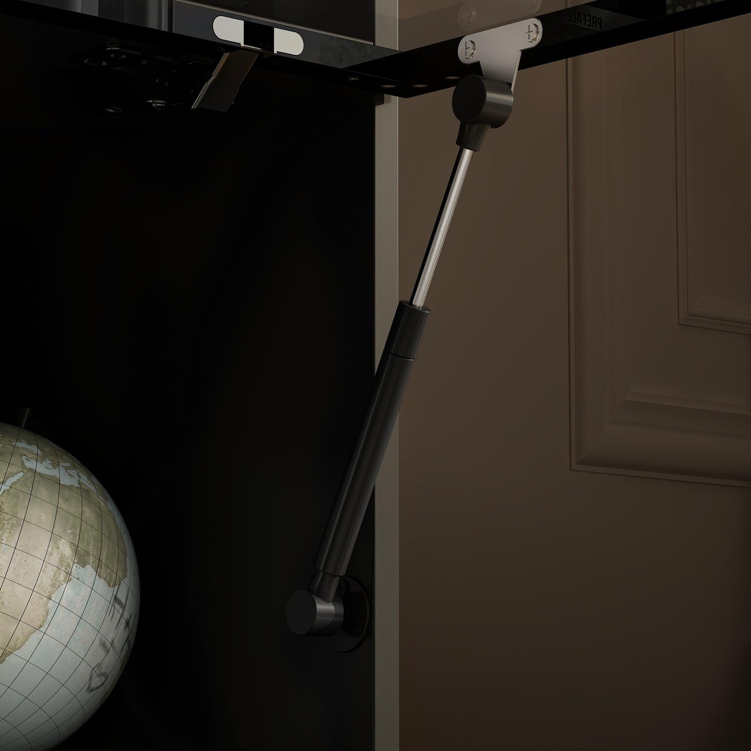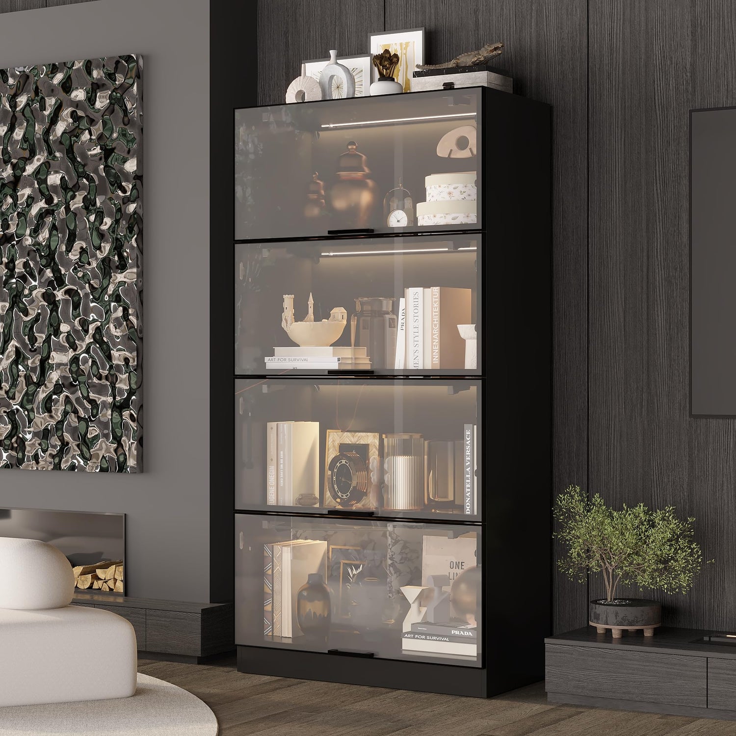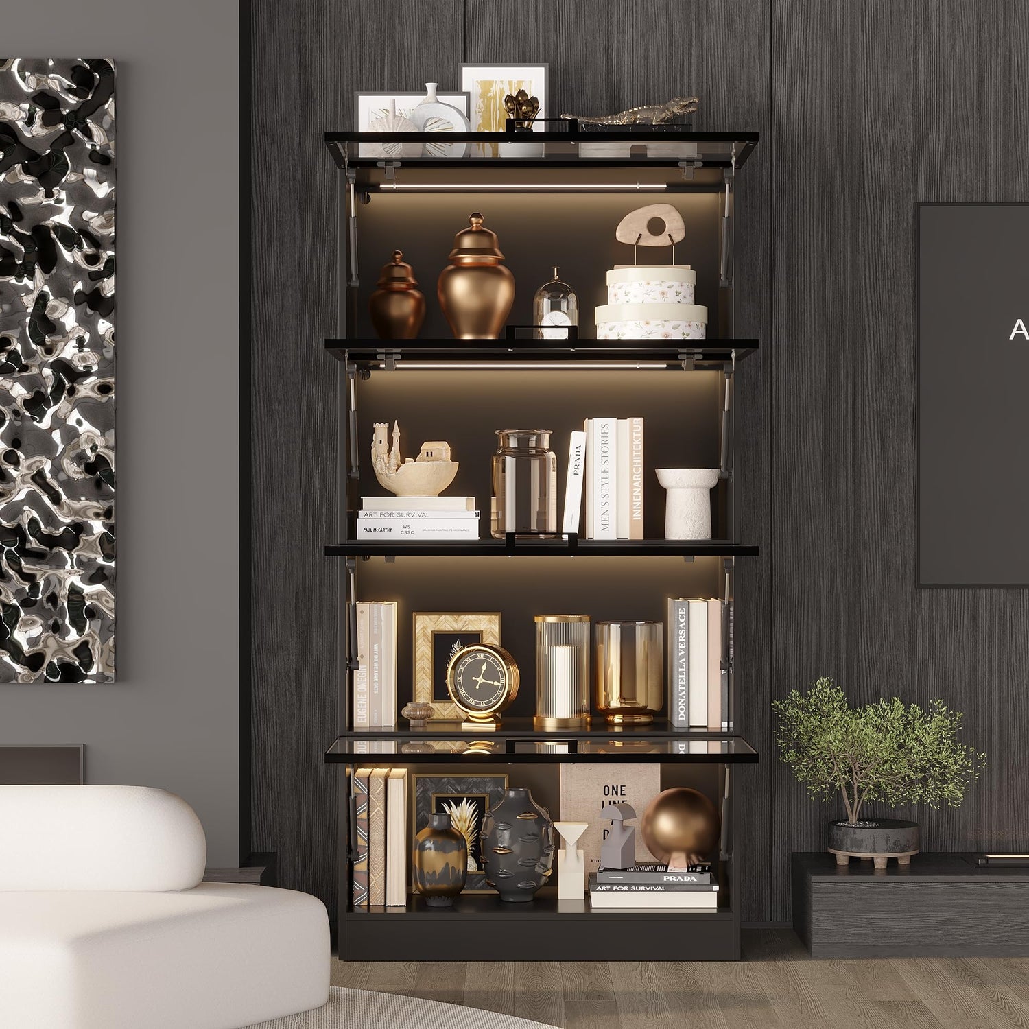 - [Flip-Up Door Design] All of the 4 glass doors flips up, increasing the visible area for better display and easy access. This 4 tier showcase includes 8 hydraulic rods, ensuring the doors stay open stablely and provide excellent support, making it easy to arrange and clean your items.