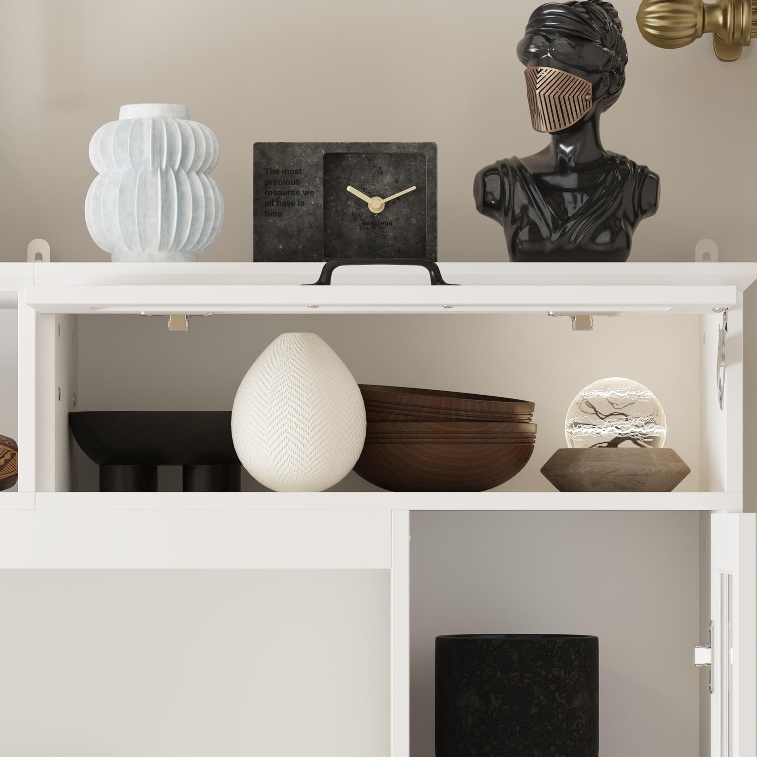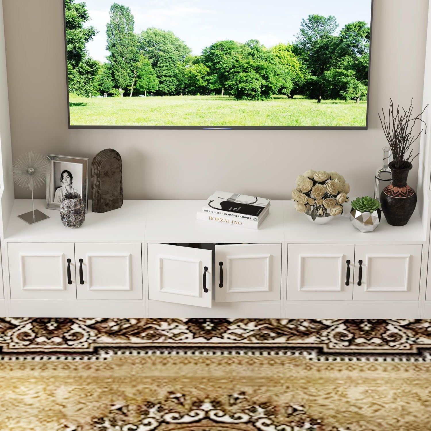 - [Ample Storage] This Large TV console set features 12 doors, providing generous storage space for media equipment, DVDs, books, and more, helping you keep your living room organized and clutter-free. The top section includes 2 flip-up doors, offering convenient access to additional storage space without taking up extra room when opened. The left and right side shelves come with adjustable shelving, providing customizable storage options.