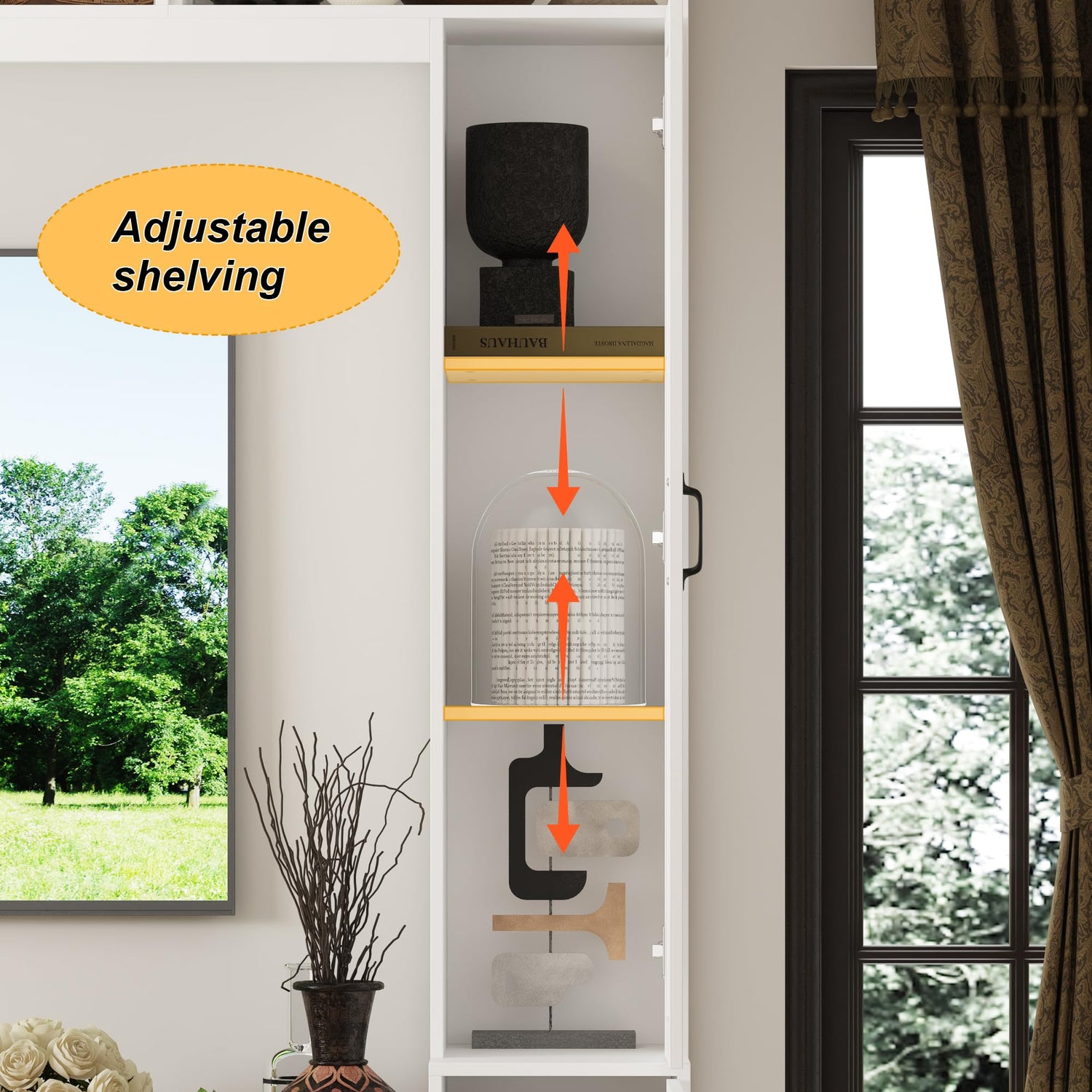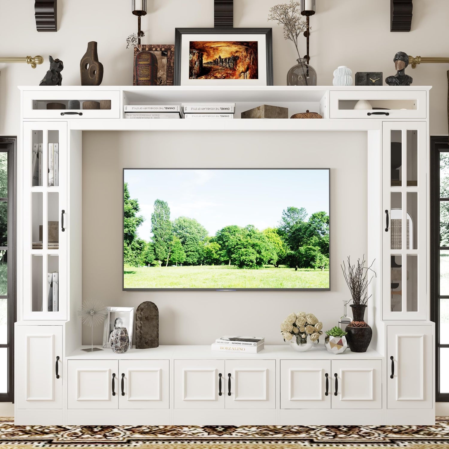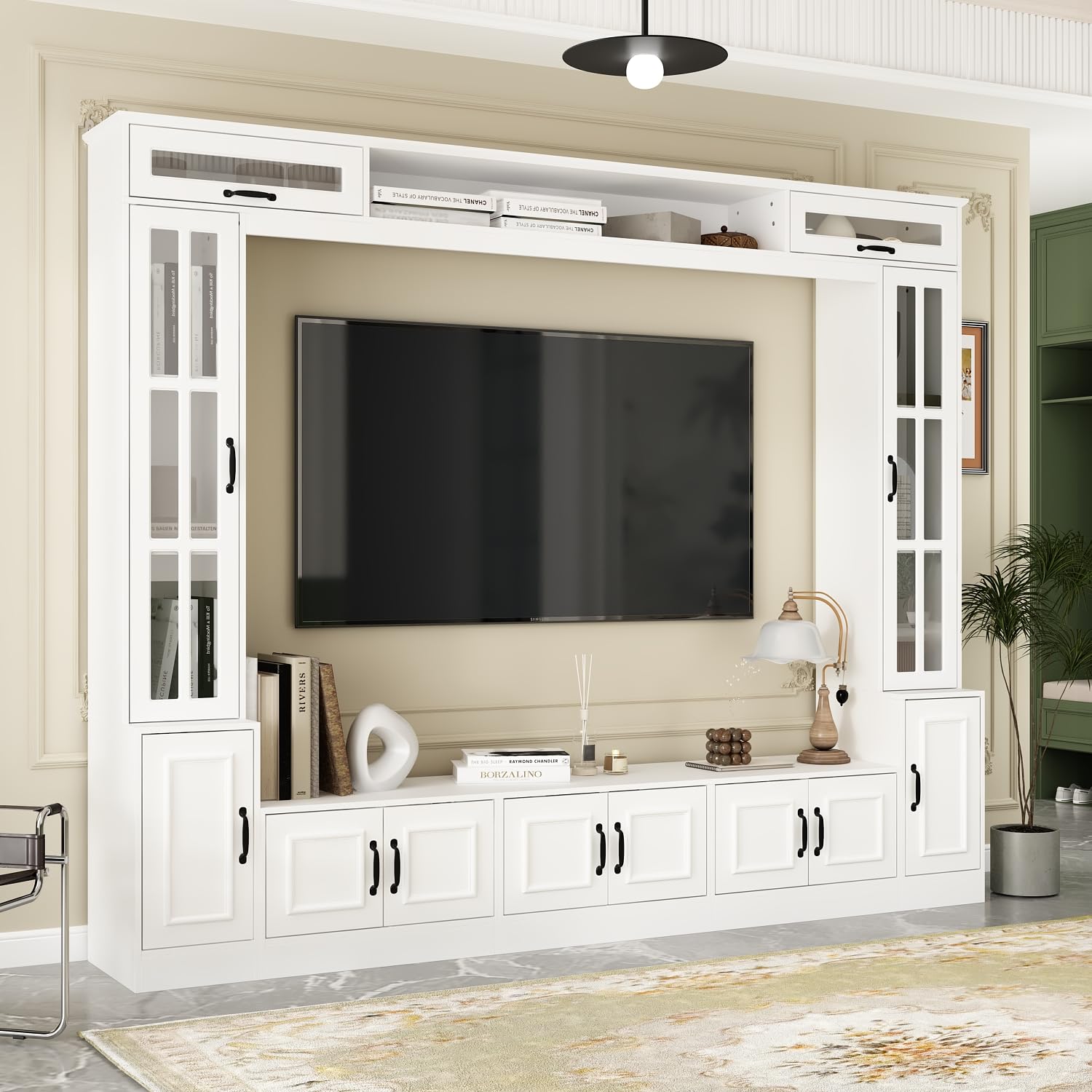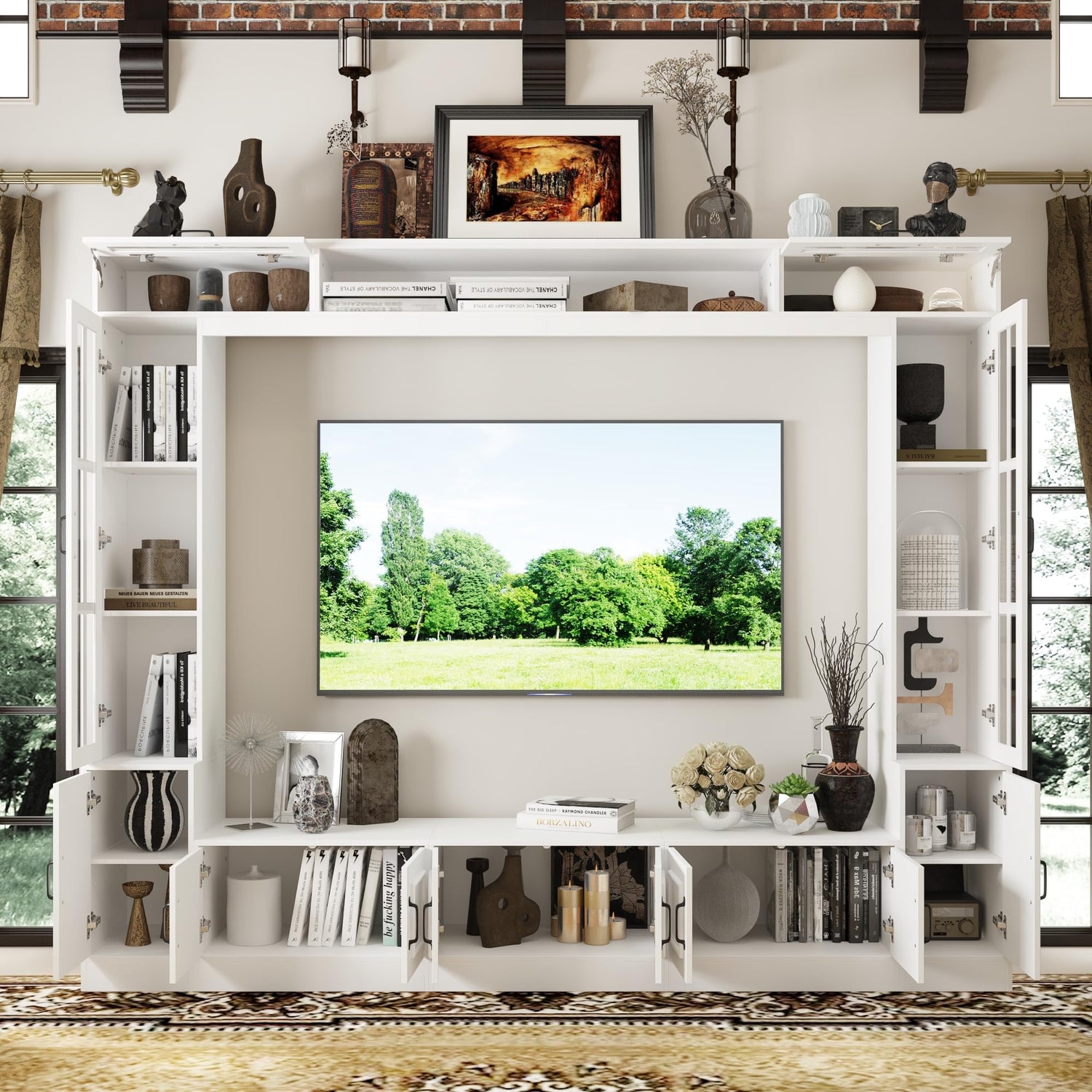 ECACAD Wall Unit Media Console Entertainment Center with 12 Doors, Large TV Stand Set with Tempered Glass Doors and Adjustable Shelves for Living Room, White (96.9”W x 15.7”D x 78.7H)
