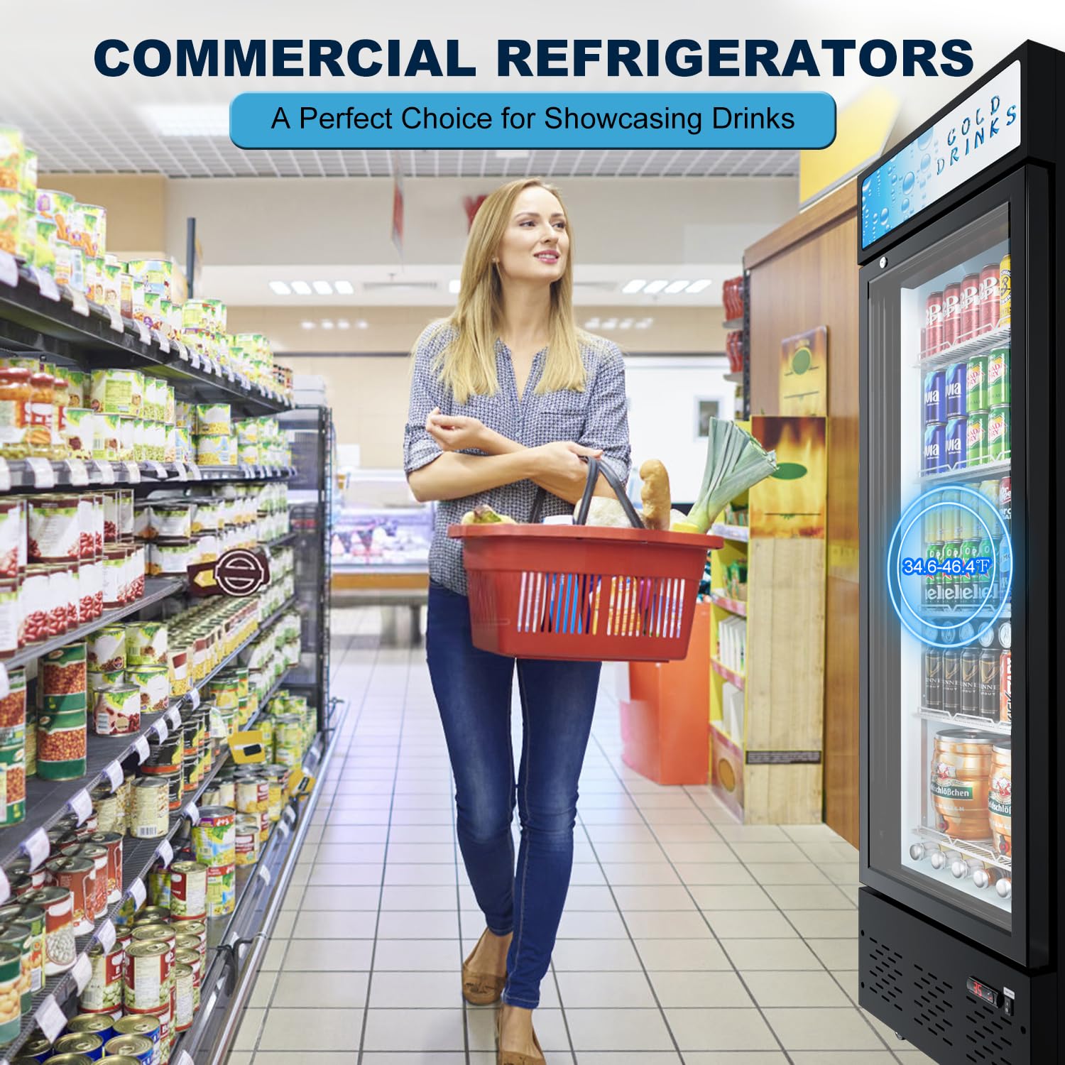 • Our upright commercial display cooler features a user-friendly digital temperature display and controls, allowing you to effortlessly monitor and adjust the temperature within the range of 34.6 to 46.4℉.It utilizes a compressor cooling method and operates with R290 refrigerant
