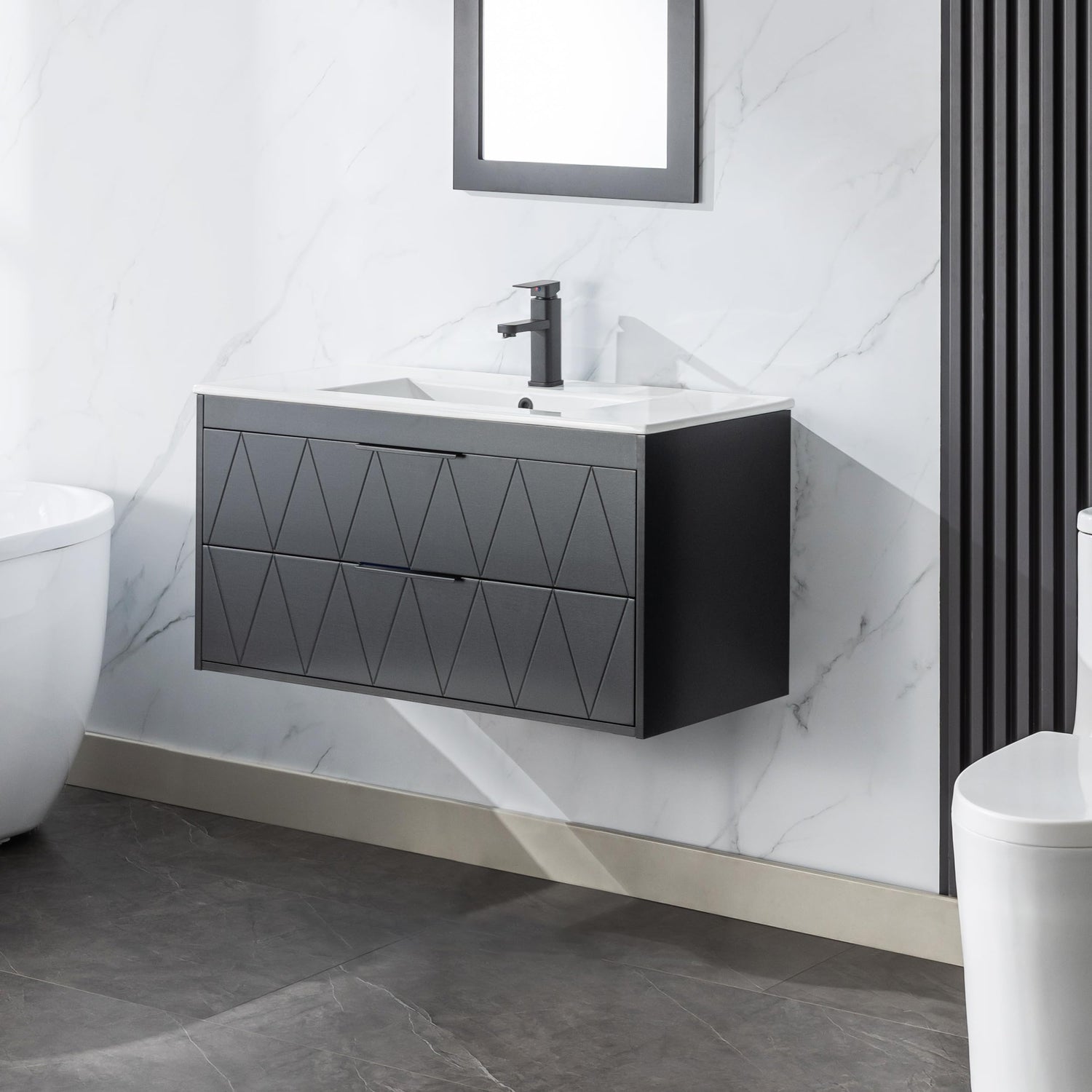 eclife 36" Bathroom Vanities Cabinet with Sink Combo, Wall Mounted Floating Cabinet W/Decor Line, Soft-Close System, 2 Extra Big Drawers, Matte Black Faucet, Black