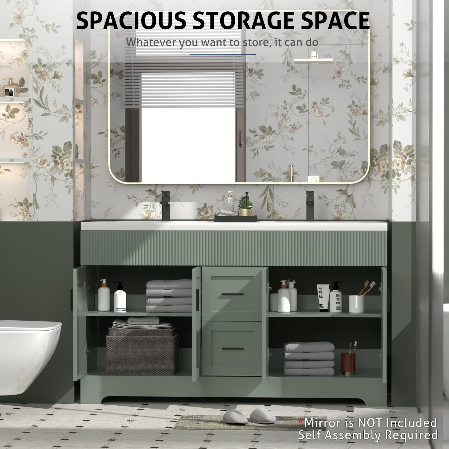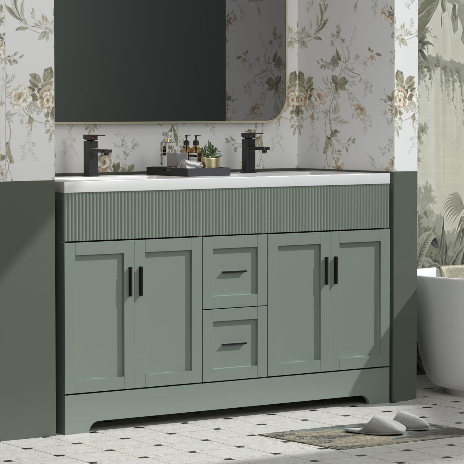 eclife 60" Bathroom Vanities Sink Combo with Painted Surface, Modern Drawered Cabinet W/Decorative Wave Lines, Undermount Double Sink, Matte Black Faucet Drain, Green