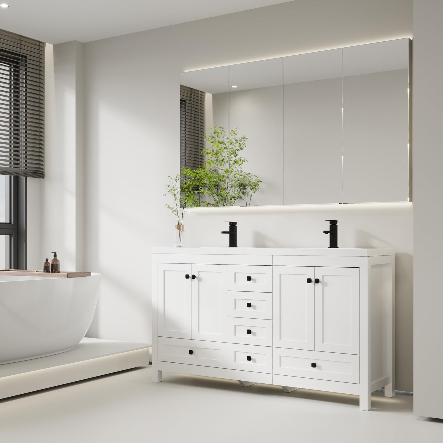 eclife 60" Bathroom Vanities with Sink Combo, Modern Thickened Wood Bathroom Storage Cabinet w/Undermount Double Sink, Matte Black Faucet Drain, Painted Surface, White