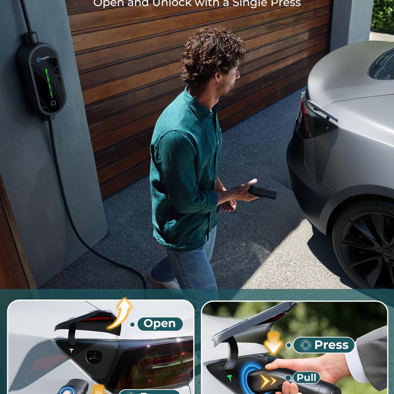- WIRELESS CONTROL CHARGE PORT DOOR OPENING: No more fumbling with manual tesla charge port door or using the vehicle touchscreen— just plug in, and Open the vehicle charge port by pressing the button on the Ecogenix Tesla charge handle, the charge port opens effortlessly. To remove the charge handle from the vehicle, press and hold the button on the handle to unlock the charge port. Saving you time and hassle during every charge, making your charging more convenient