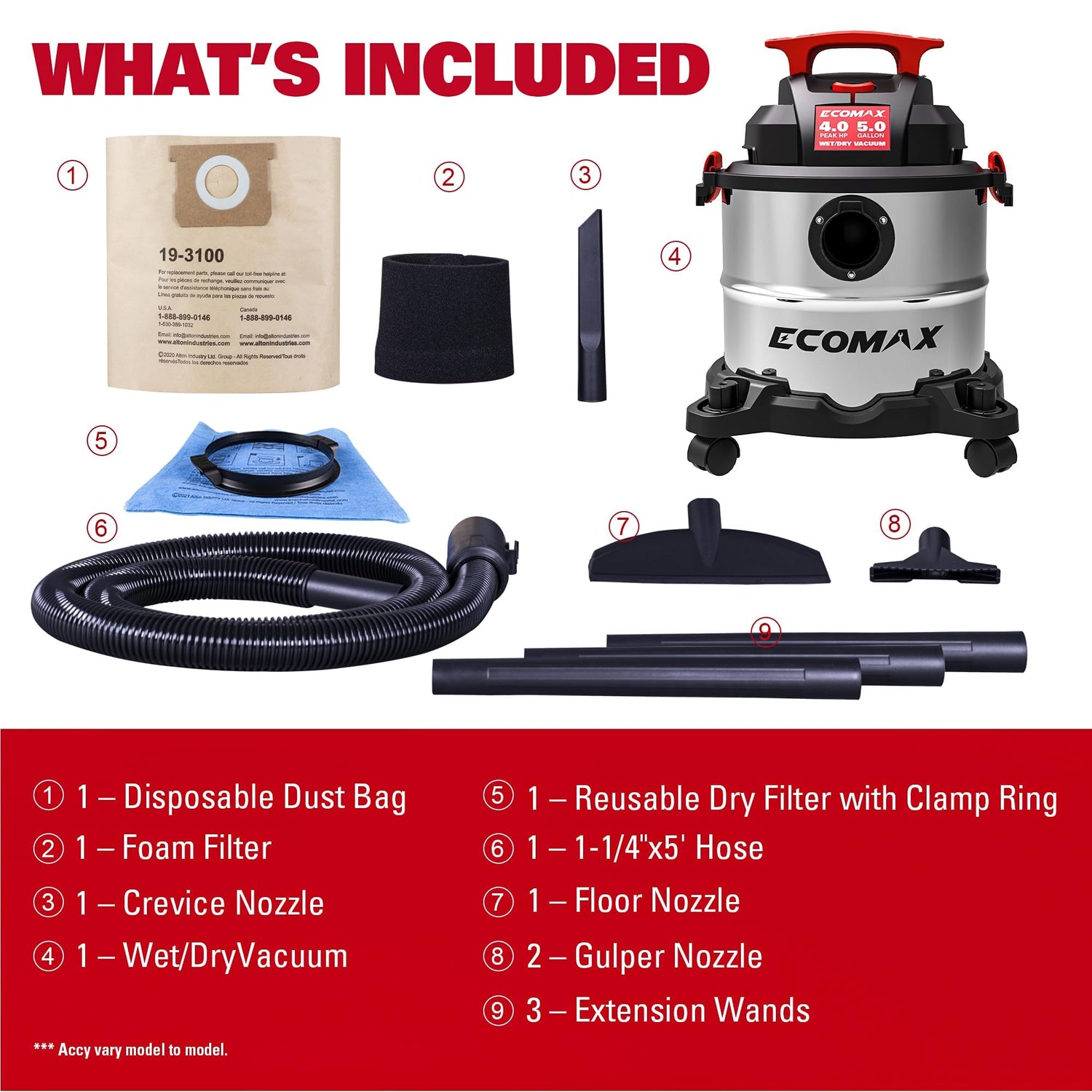 ECOMAX Wet Dry Vac 5 Gallon, 4 Peak HP, Portable Stainless Steel Shop Vacuum Wet/Dry with Powerful Suction-85 CFM, 3-in-1 Wet/Dry/Blow, Shop Vacuum for Home, Workshop, Jobsite, EM18115