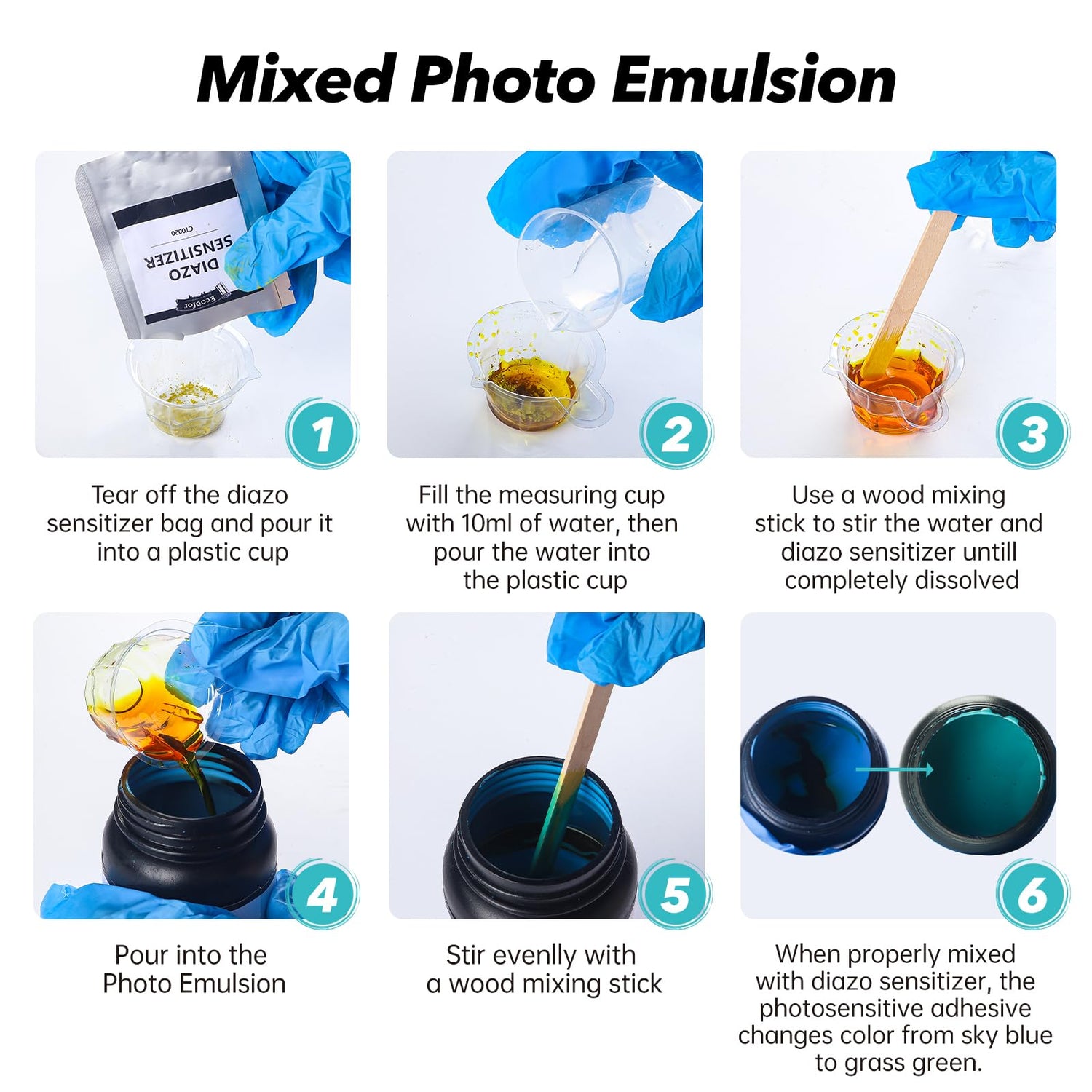 - All-in-one package: The kit contains various tools and materials needed for screen printing: 3 Screen Printing Frames,1 Screen Printing Squeegee,1 Emulsion Scoop Coater,6 Color Inks,1 50W UV Lamp Kit,1 50ml Measuring Cup,2 Plastic Cups,1 Ink Knife,8 Gloves,1 Photo Emulsion Kit,1 Sensitizer,1 Plastic Scraper,1 Tape,15 A4 size films,10 Wood Mixing Stick