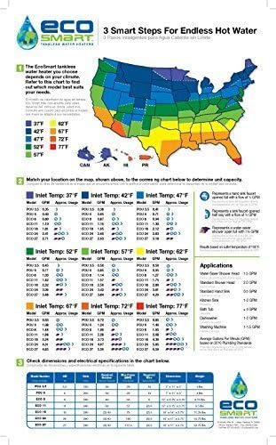 Details: Product Description ECO 11 can be used for multiple or single applications depending on your climate. ECO 11 can provide hot water for one shower in colder climates, or two showers in warmer climates.Temperature range of 80-140°F (add in C) From the Manufacturer This Smart Technology electric tankless water heater is configured for climates where incoming water temperature is 67 Degree F and above. This model is well suited for heating up to 2-Gallon per minute, which is the equivalent of one shower head (with a 1.5 gpm flow) and one sink with a low inlet water temperature of 67 Degree F. Digital Temperature Control allows you to set your temperature in increments of 1 Degree. This model can also be used in colder climates as a Point of Use for a sink or other low flow application. Prior to purchase and installation please verify this model is the rights size for your hot water needs and electrical requirements.