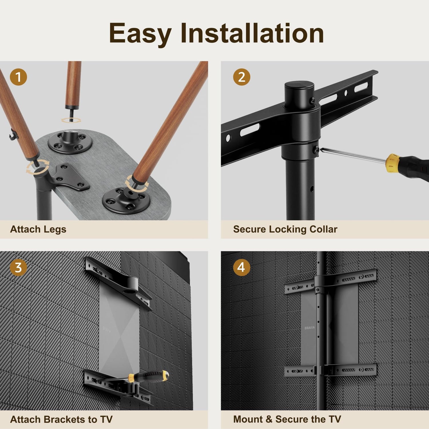 - 【Enjoy Better Views】By using the ergonomic height adjustment function, you can adjust the TV to the correct level for your eyes. This TV tripod stand's bracket allows for a 45 degree left and right swivel, which could prevent light reflections. An ergonomic swievel TV stand is beneficial in preventing painful symptoms in your eyes and neck muscles.