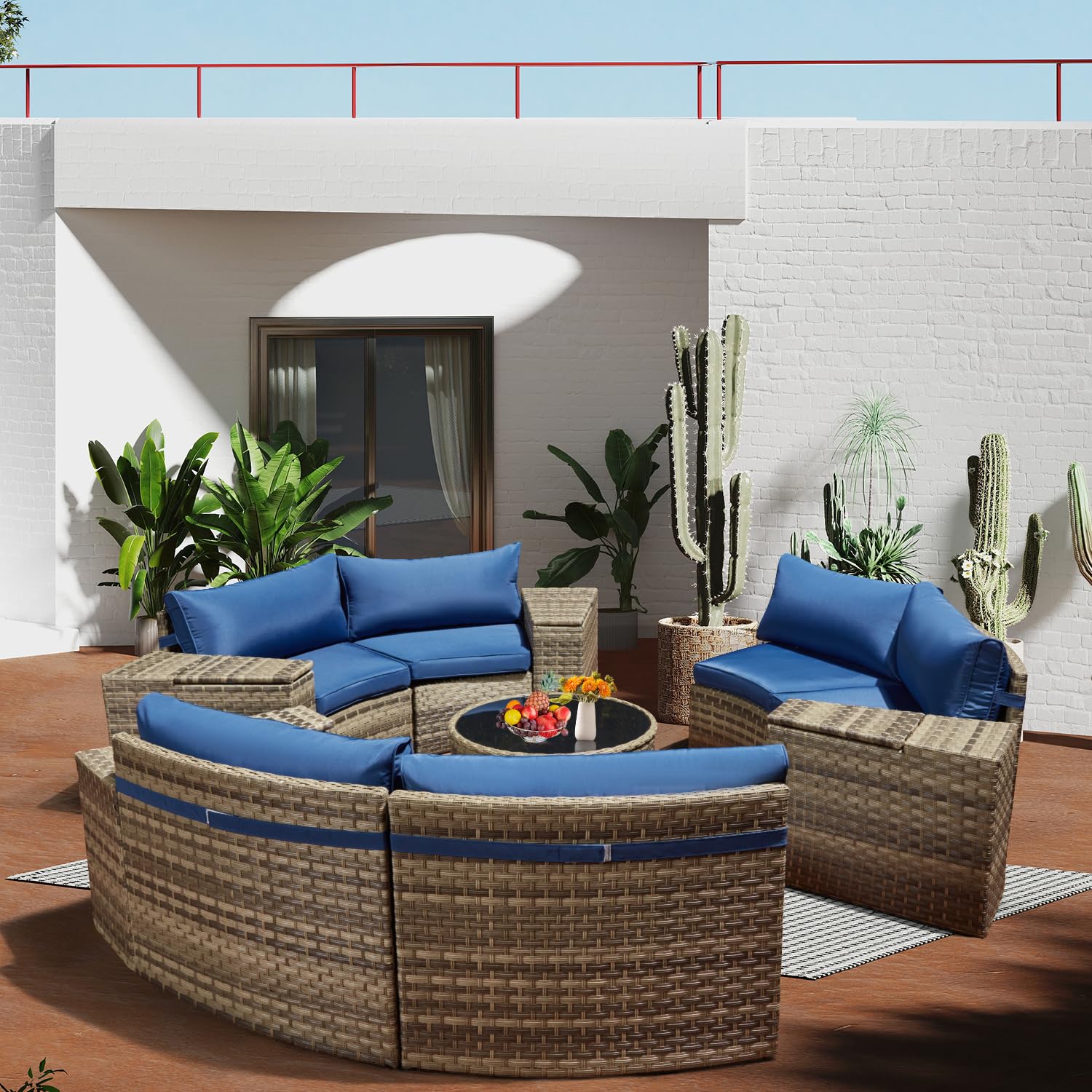 ECOTOUGE Outdoor Patio Furniture, 11-Piece Half-Moon Sectional Patio Furniture Set Curved Sofa with Tempered Glass Round Coffee Table, Fit for Pool Backyard Balcony Porch Lawn(Blue)