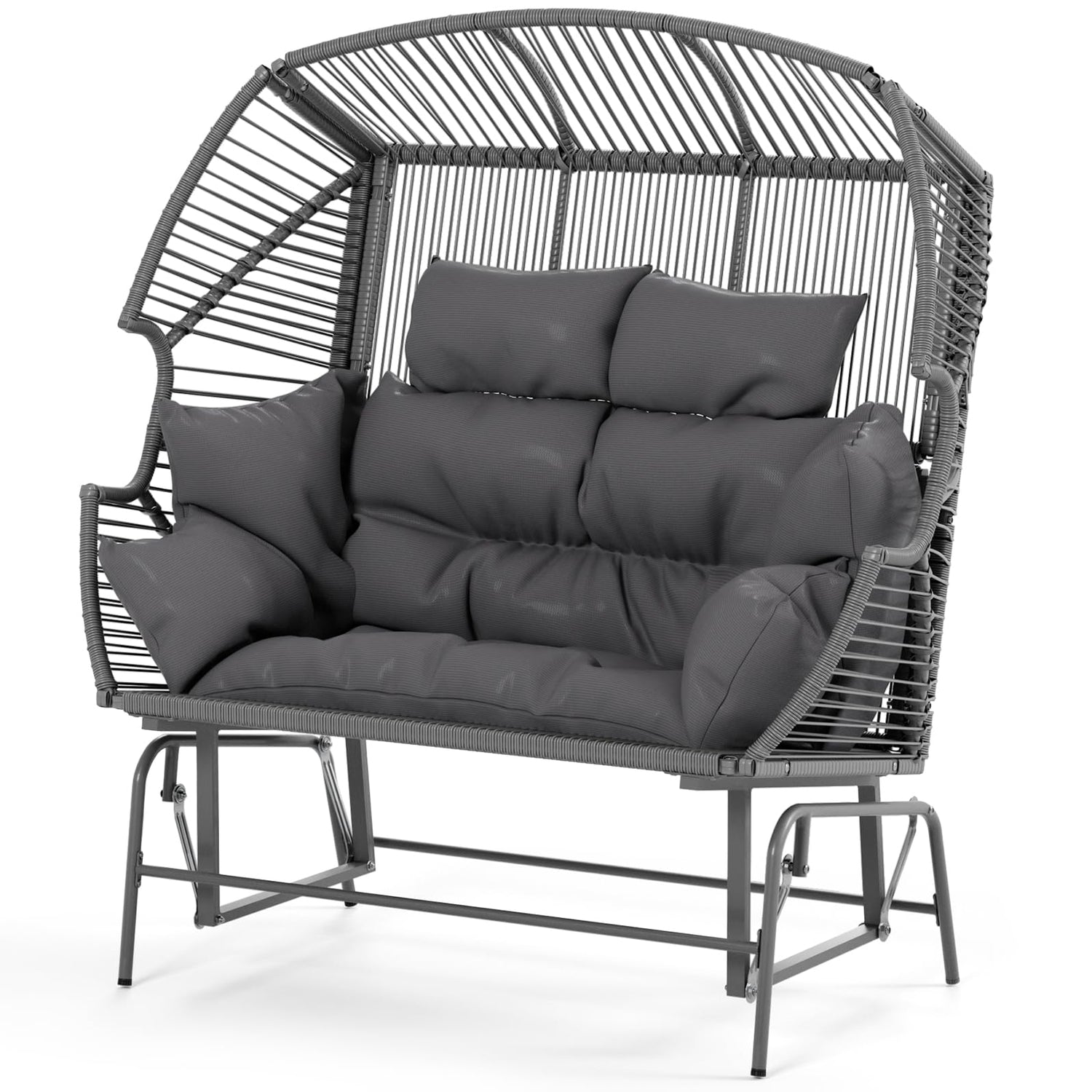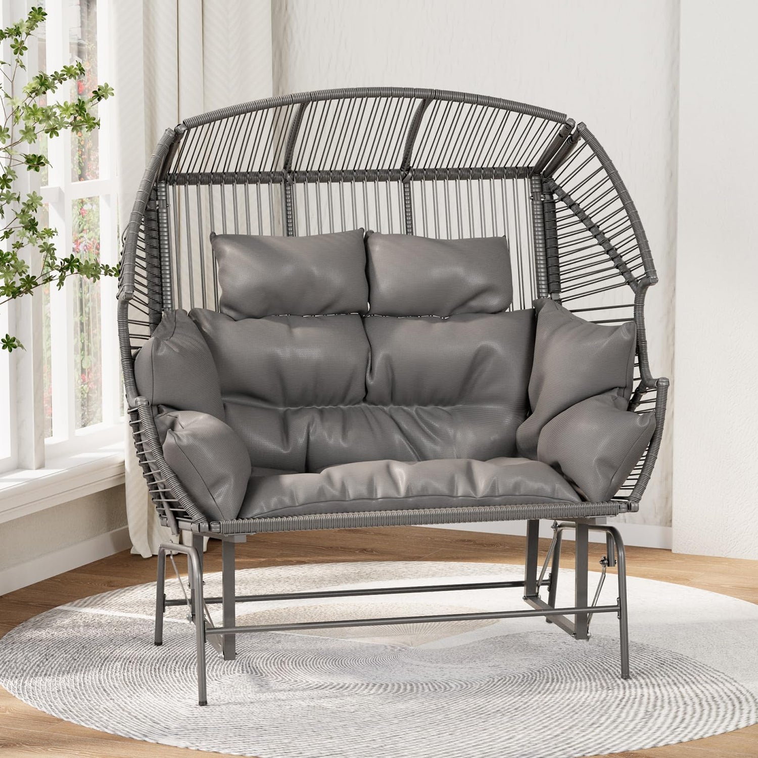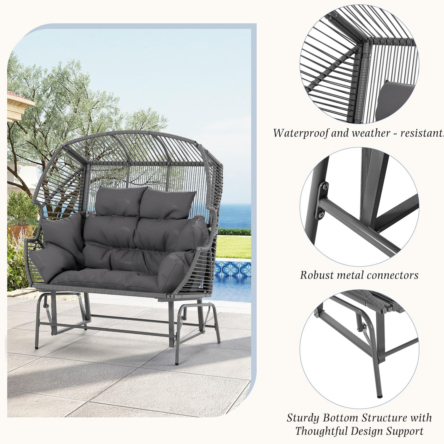 ECOTOUGE Patio Double Egg Chair, Indoor Outdoor Oversized Loveseat, 2 Person Extra Large Wicker Lounge Rocking Glider Chairs w/Thicken Padded Cushions and Pillow for Garden Balcony Sunroom, Grey