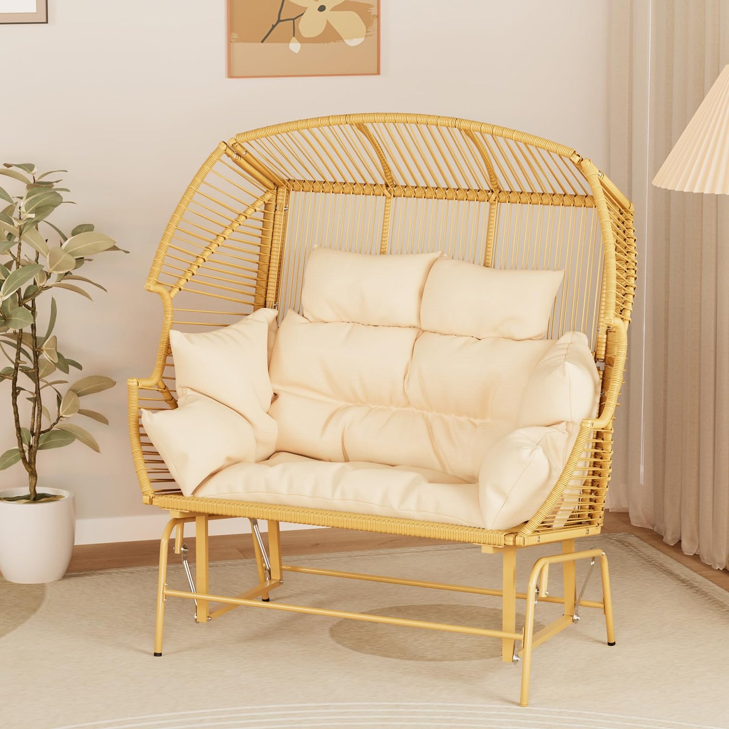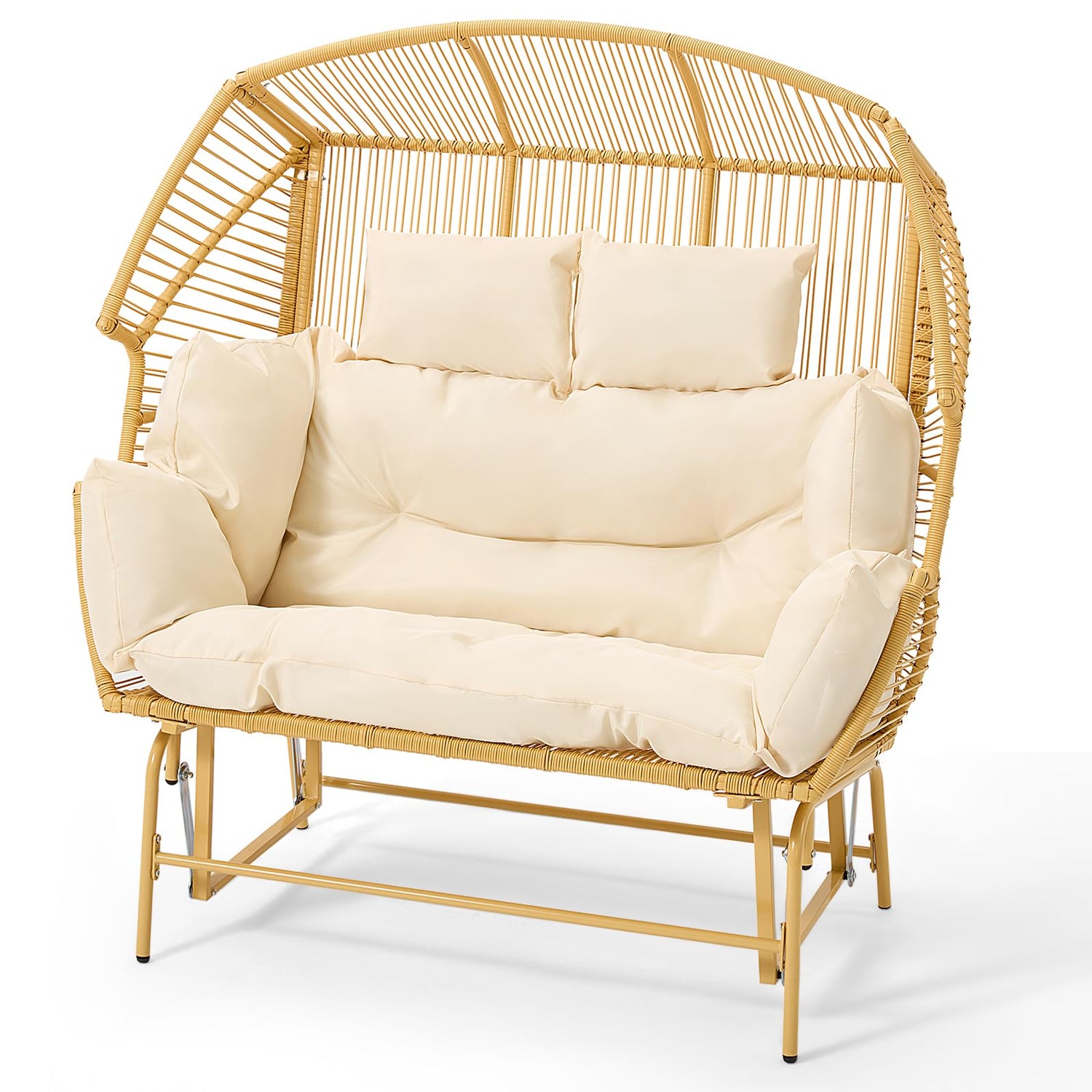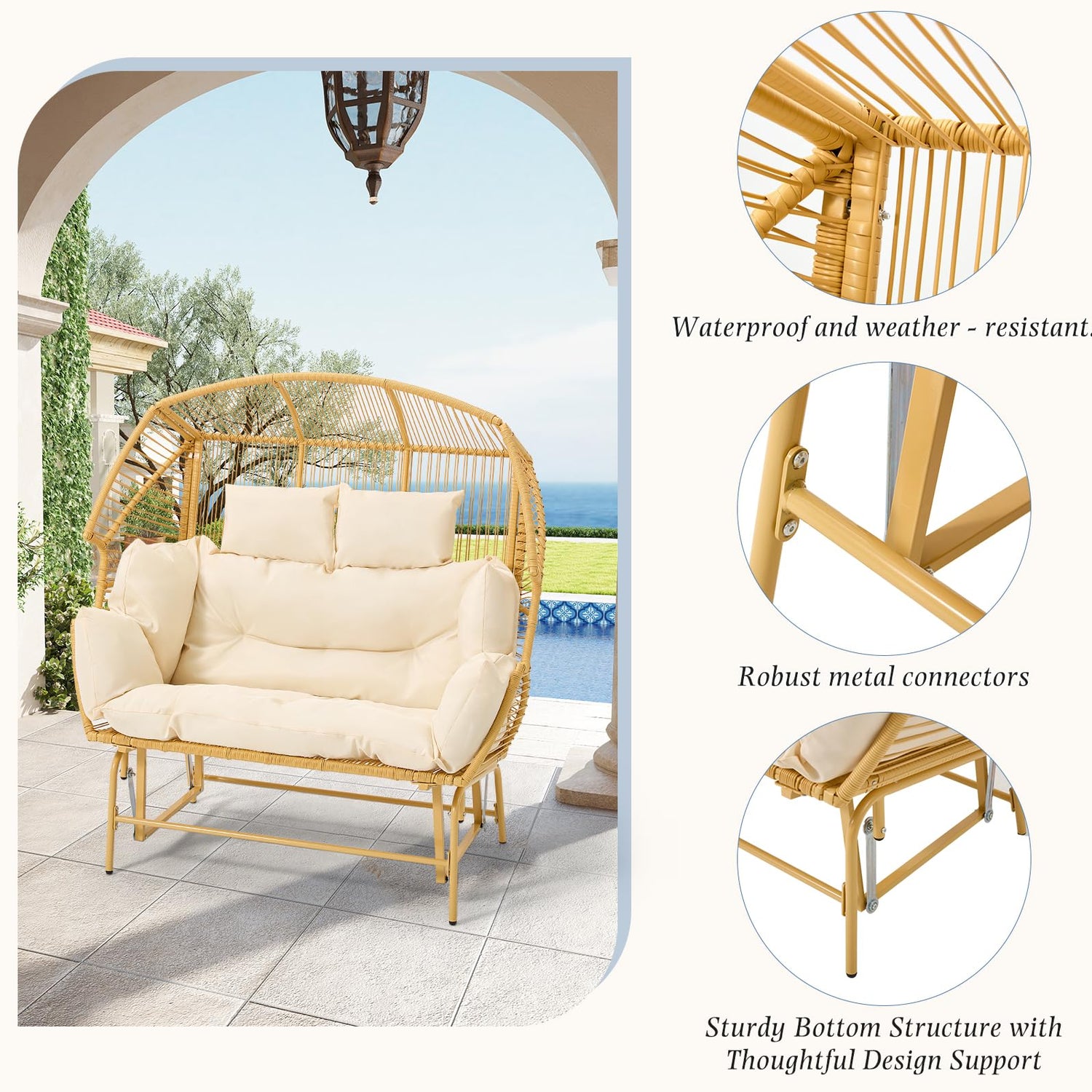 ECOTOUGE Patio Double Egg Chair, Indoor Outdoor Oversized Loveseat, 2 Person Extra Large Wicker Lounge Rocking Glider Chairs w/Thicken Padded Cushions and Pillow for Garden Balcony Sunroom, Yellow